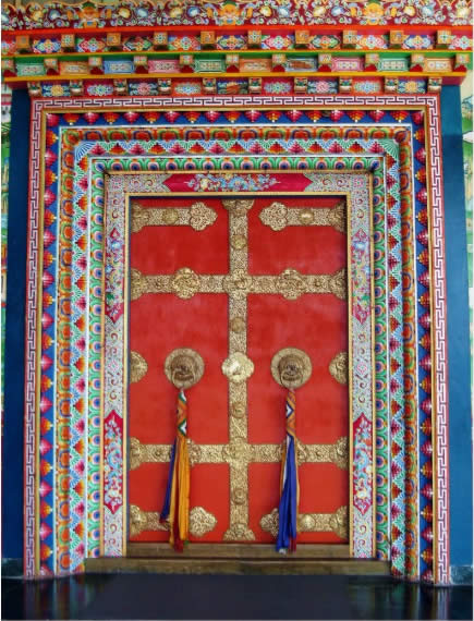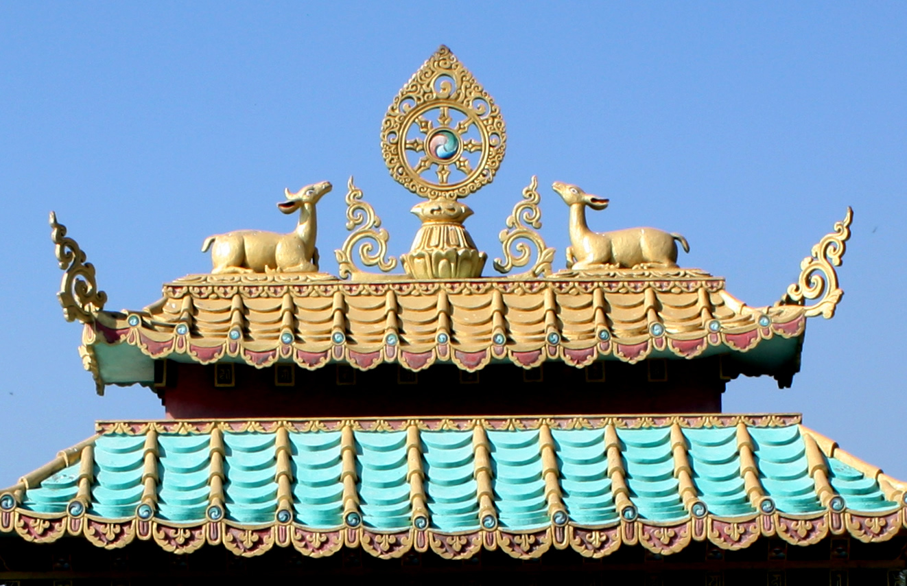 A golden dharmachakra flanked by two deer and the precious parasol will rest above the main entrance, which faces east. This is a feature found on all Tibetan Buddhist temples. The emblem of the vajra knot will be inscribed over the west entrance. Traditional sculptures of garudas and dragons will ornament the curved corners of the roof.