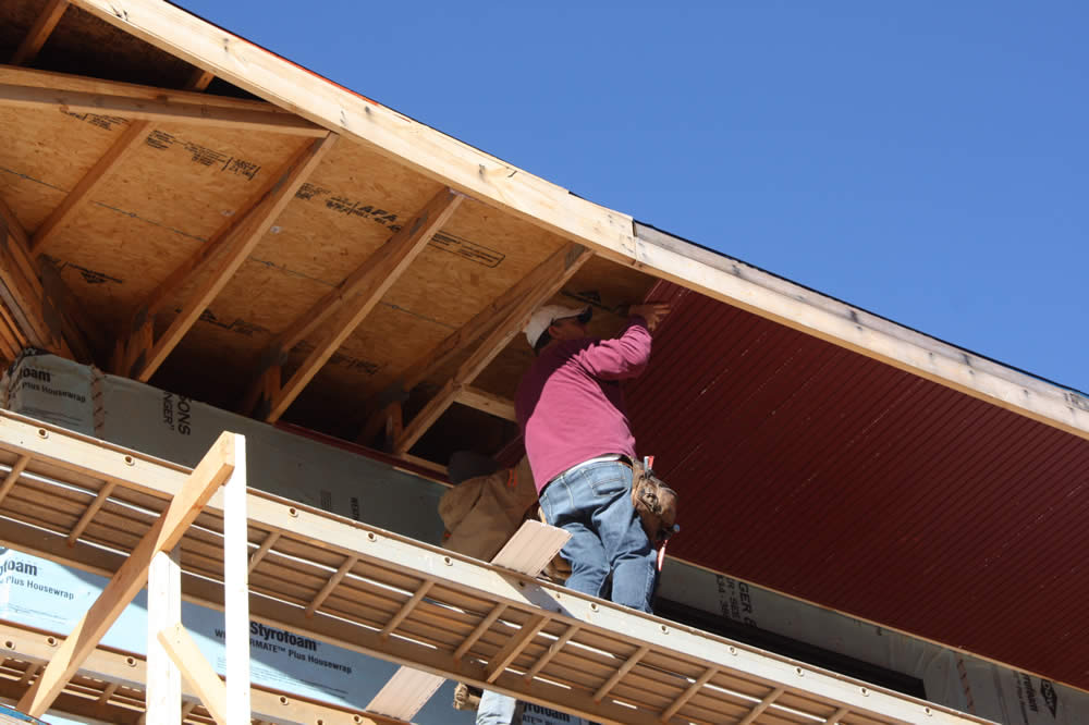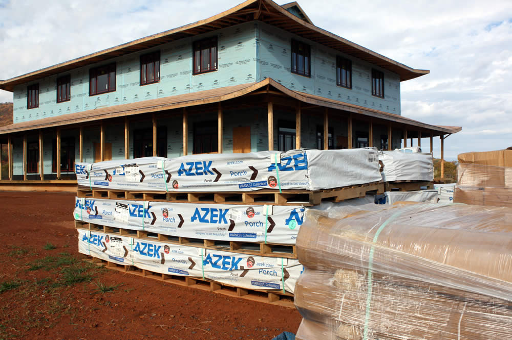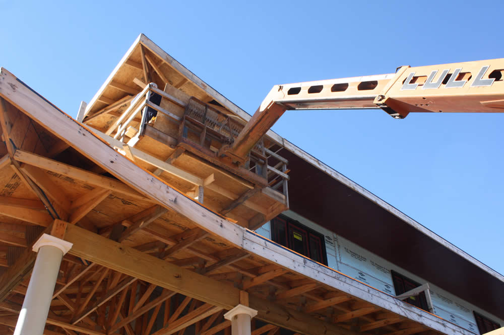 Workers are currently installing the flooring on the 12-foot wide veranda, which encircles the building. Forty-four red columns will support the veranda roof. Four traditional red temple doors with decorated frames, facing the four directions, will open onto the veranda for additional seating.