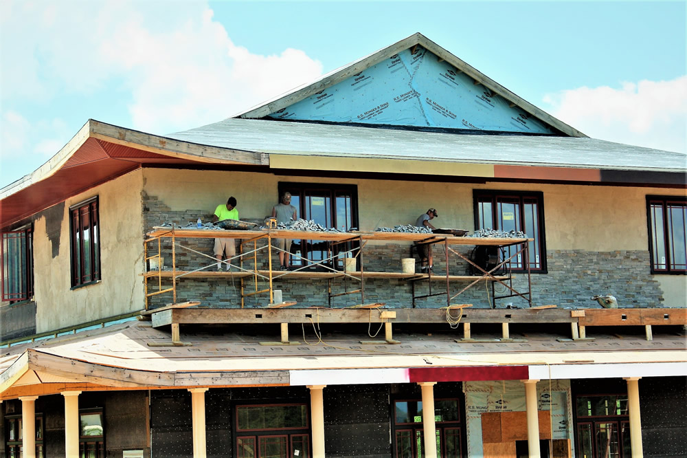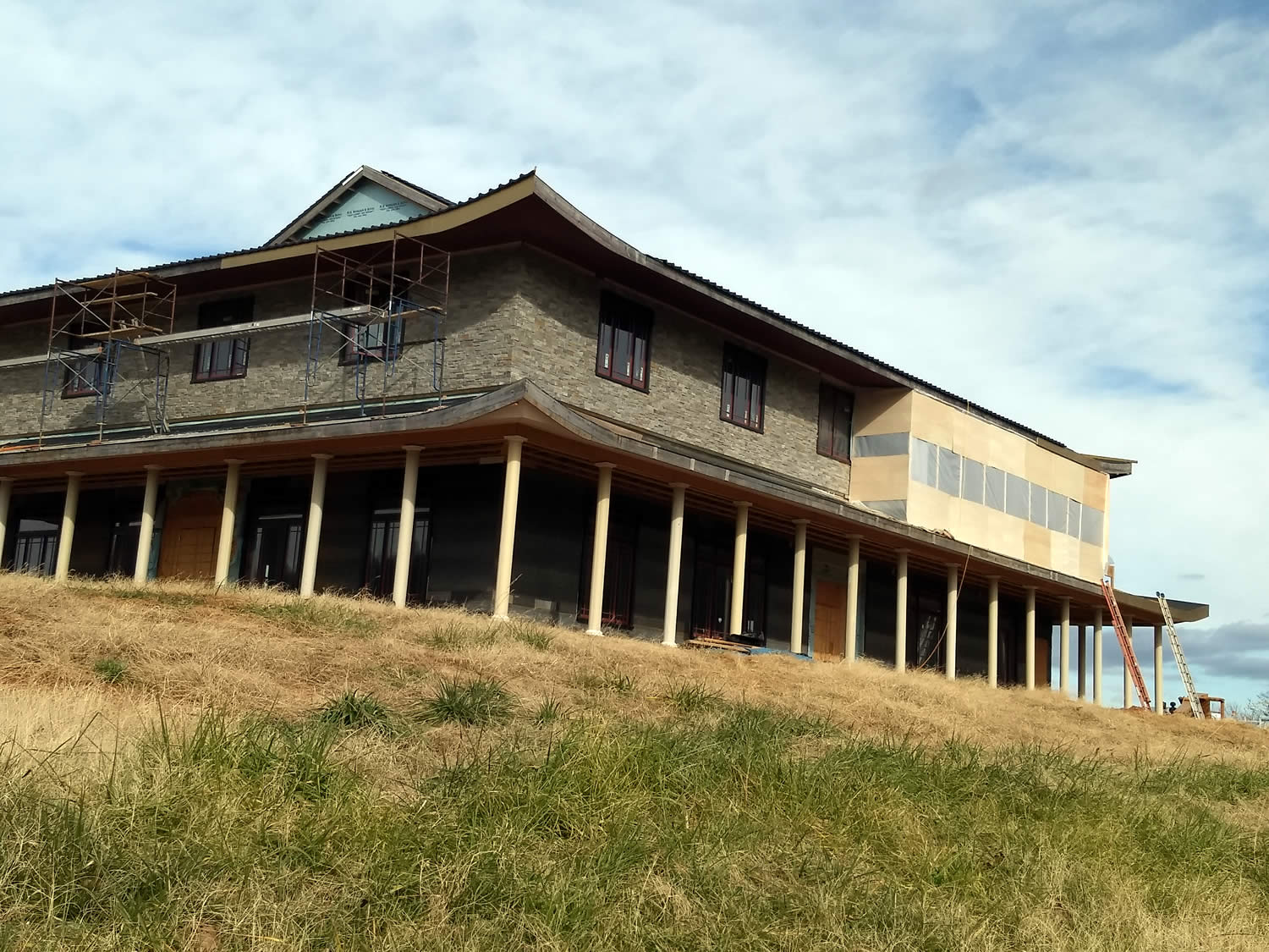 Earlier this year, the walls of the two-story temple were erected. The roof features a sweeping curvature, rising up at the corners, reminiscent of traditional Asian temples. Clay roof tiles en route from Japan will be installed upon arrival. The facade will feature stone work similar to the renowned temple of the Mindrolling Monastery in Tibet.
