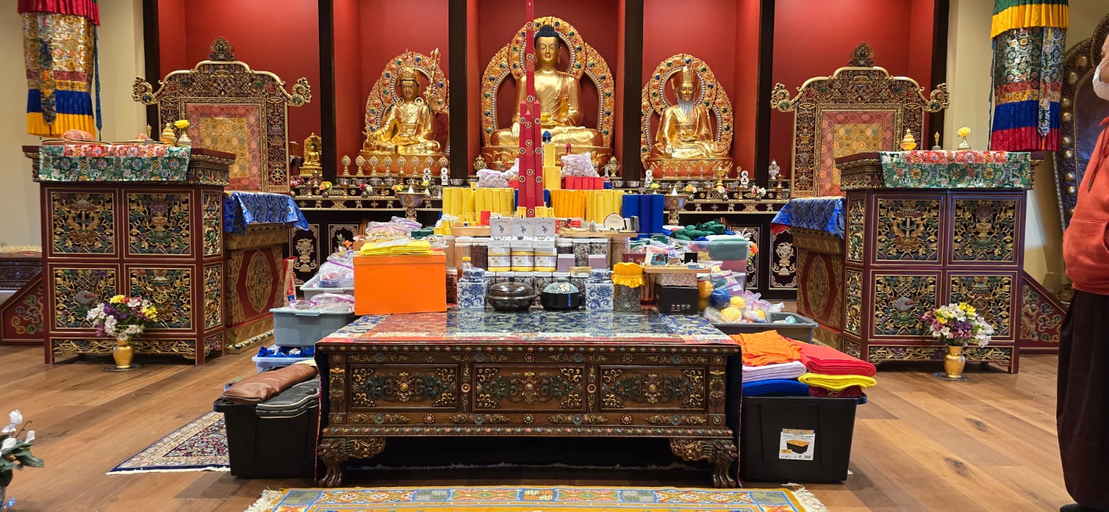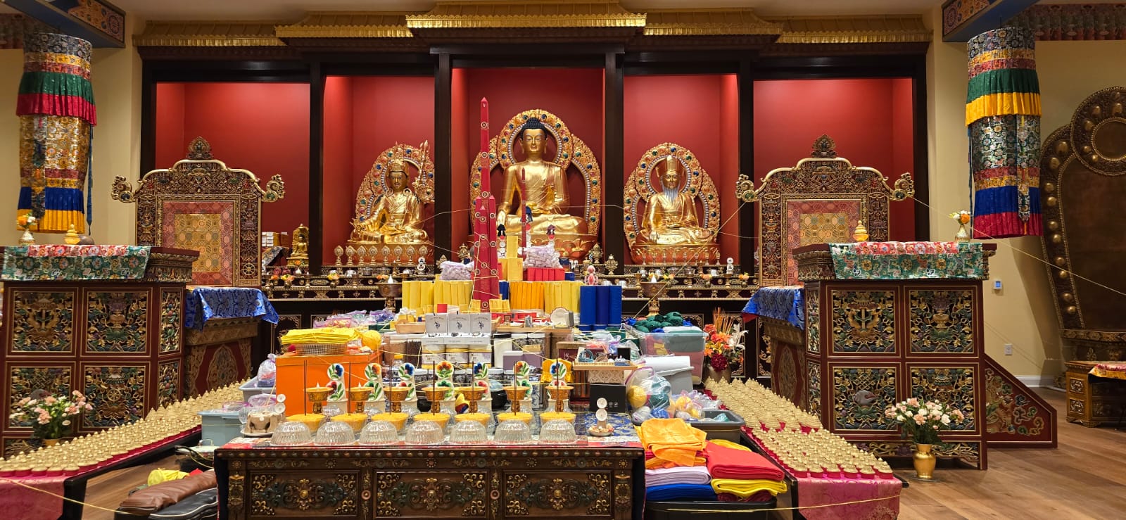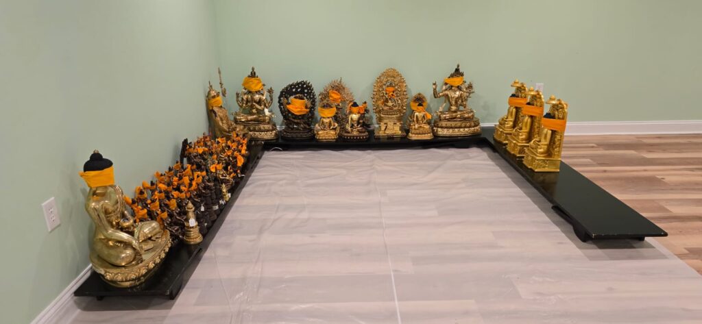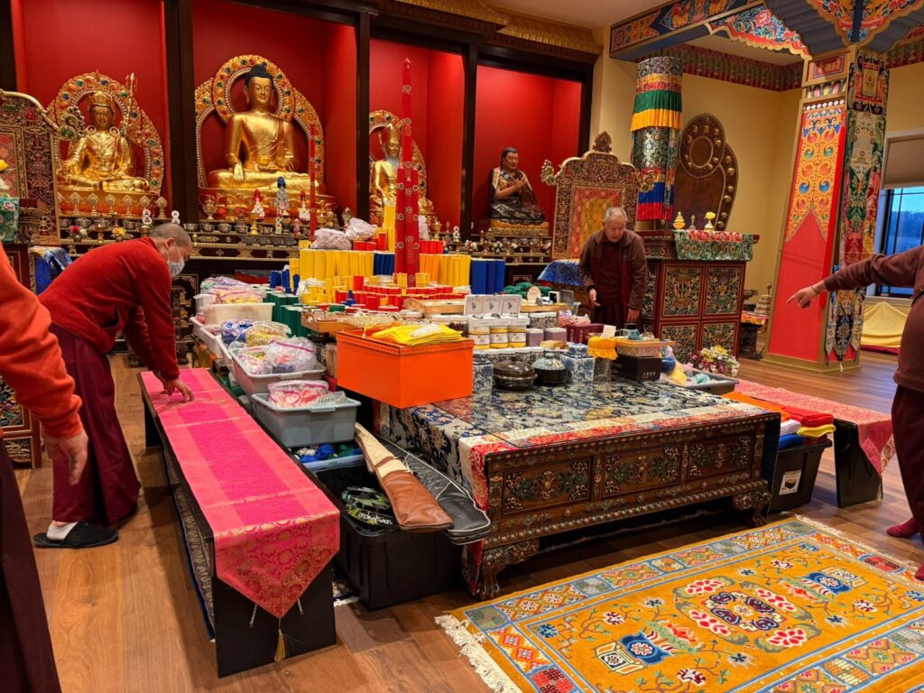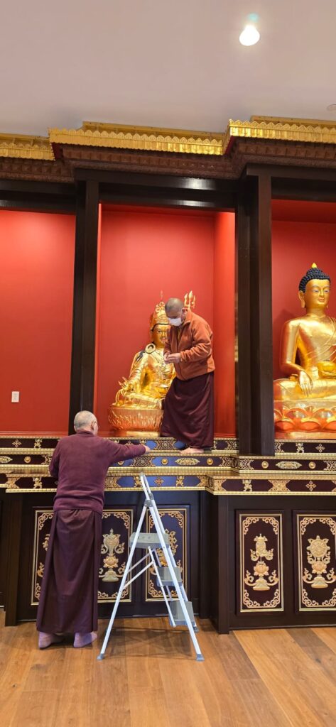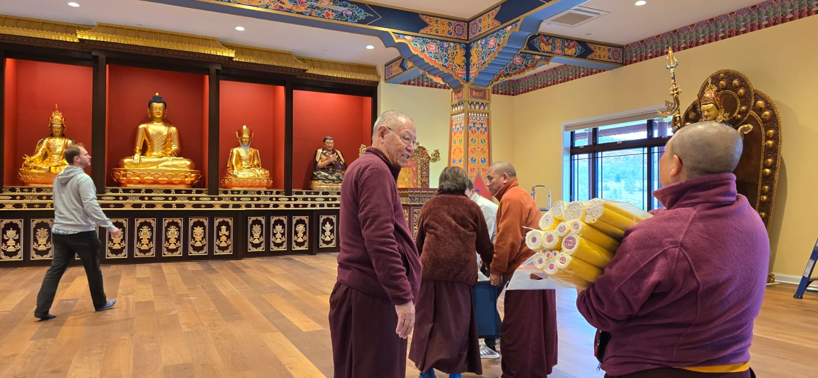 In November 2024, sangha members gathered in Minling Lotus Garden under the guidance of Minling Jetsün Khandro Rinpoche and Minling Jetsün Dechen Paldrön to continue working to bring the new temple to completion. Within a matter of days, the temple was cleaned thoroughly and transformed into a sacred environment. The statues of Buddha Shakyamuni, Guru Rinpoche, Chögyal Terdag Lingpa, and Kyabje Minling Trichen were prepared for filling, and the offerings, thrones, seats, and tables filled the shrine room for the first time as the victory banners and pillar ornaments were hung.