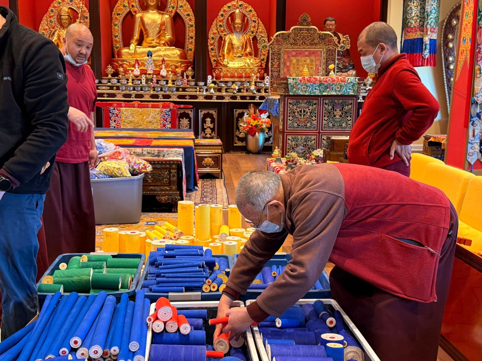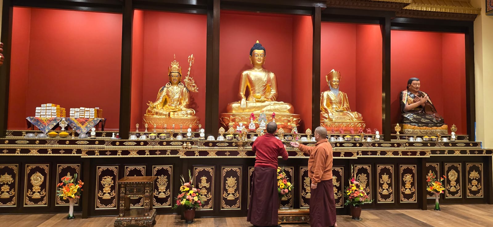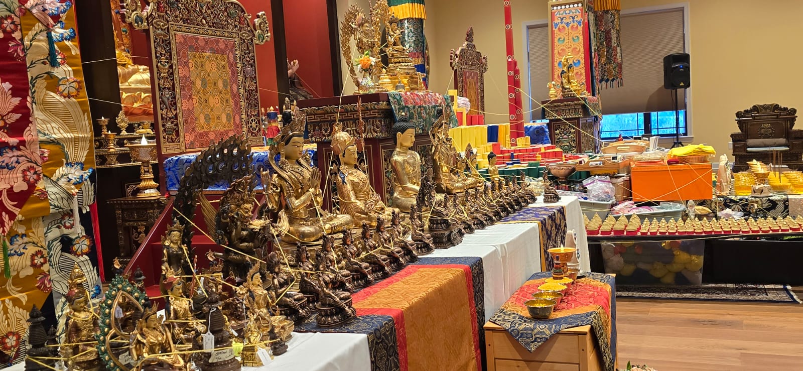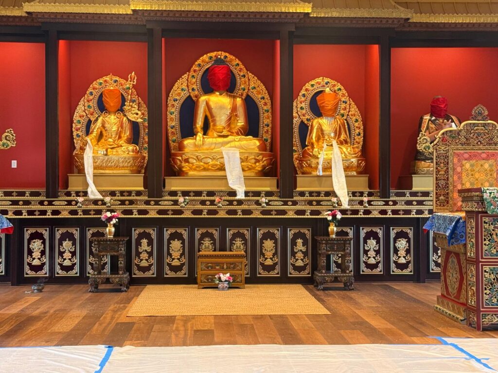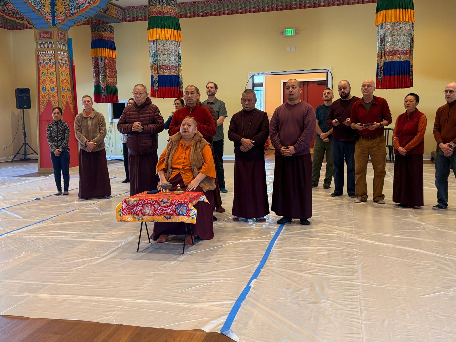 In November 2024, sangha members gathered in Minling Lotus Garden under the guidance of Minling Jetsün Khandro Rinpoche and Minling Jetsün Dechen Paldrön to continue working to bring the new temple to completion. Within a matter of days, the temple was cleaned thoroughly and transformed into a sacred environment. The statues of Buddha Shakyamuni, Guru Rinpoche, Chögyal Terdag Lingpa, and Kyabje Minling Trichen were prepared for filling, and the offerings, thrones, seats, and tables filled the shrine room for the first time as the victory banners and pillar ornaments were hung.