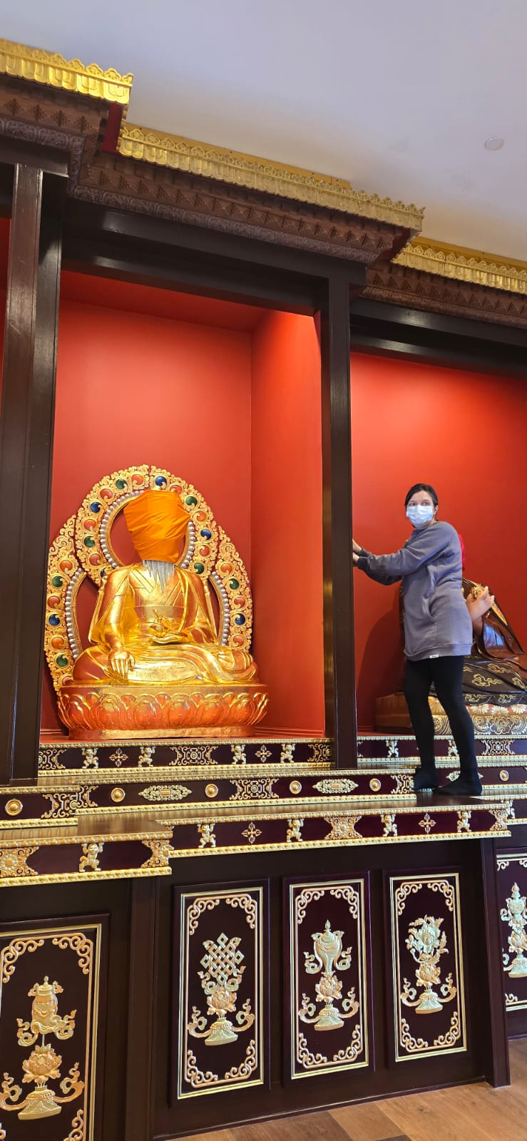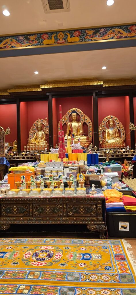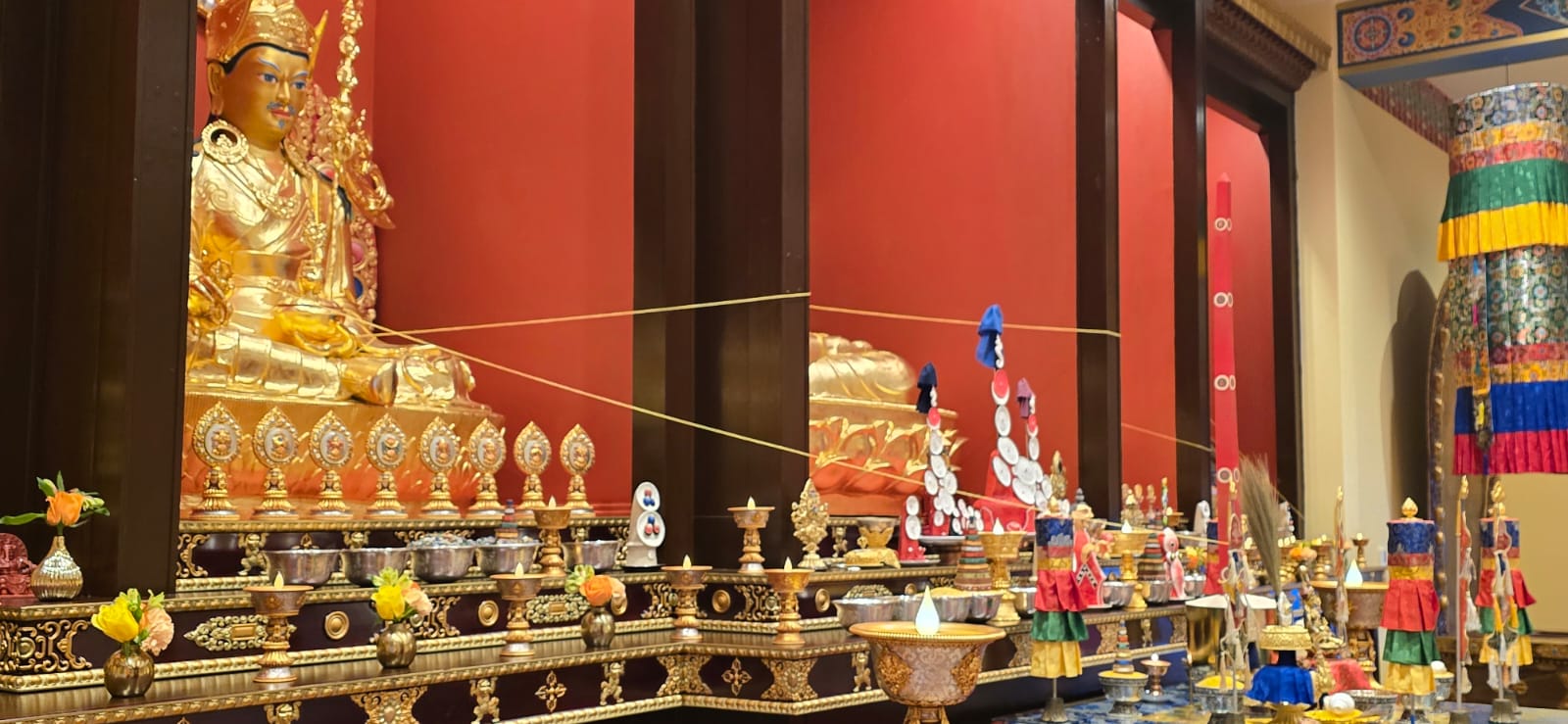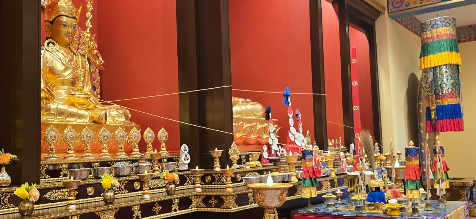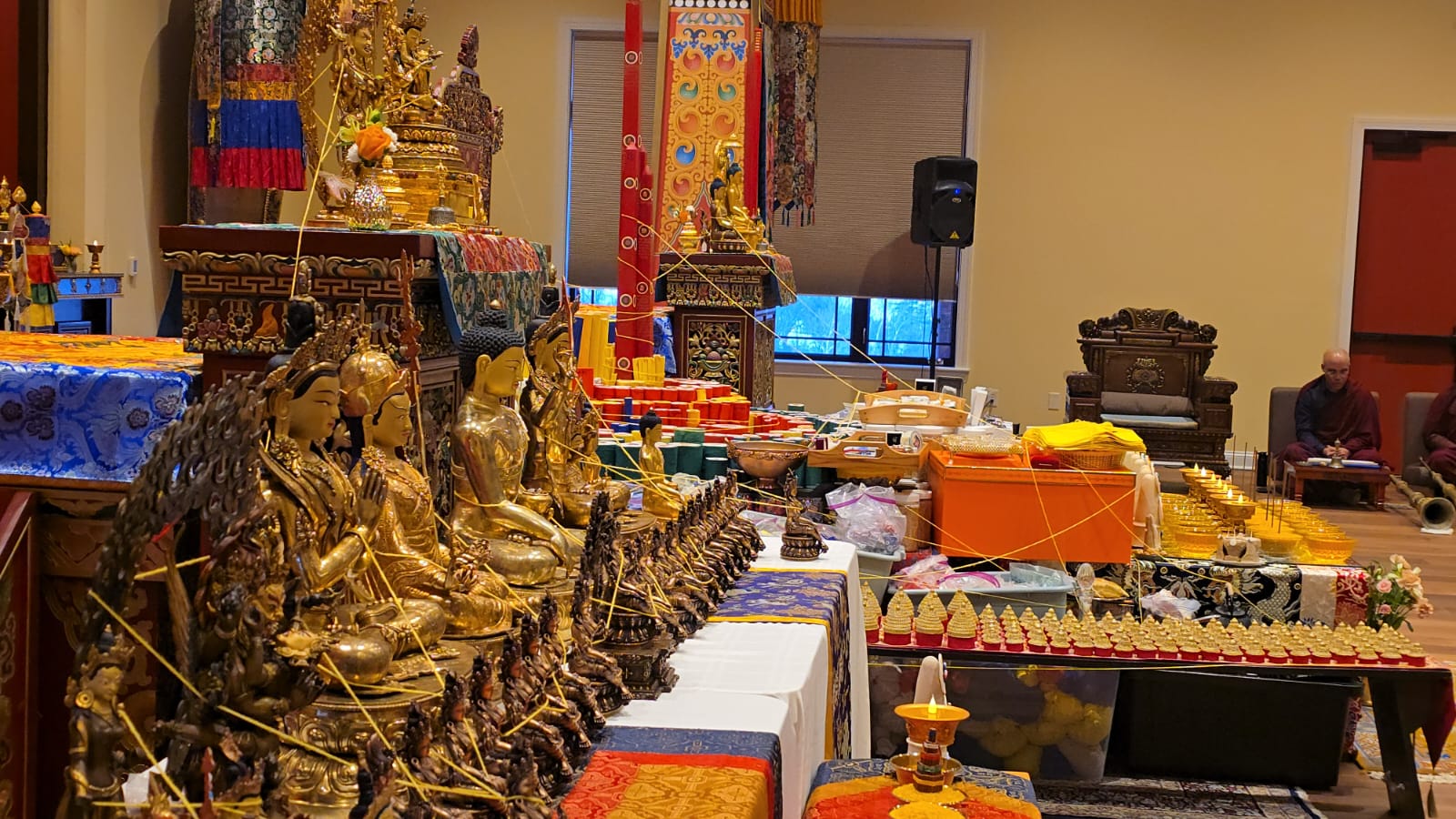 In November 2024, sangha members gathered in Minling Lotus Garden under the guidance of Minling Jetsün Khandro Rinpoche and Minling Jetsün Dechen Paldrön to continue working to bring the new temple to completion. Within a matter of days, the temple was cleaned thoroughly and transformed into a sacred environment. The statues of Buddha Shakyamuni, Guru Rinpoche, Chögyal Terdag Lingpa, and Kyabje Minling Trichen were prepared for filling, and the offerings, thrones, seats, and tables filled the shrine room for the first time as the victory banners and pillar ornaments were hung.