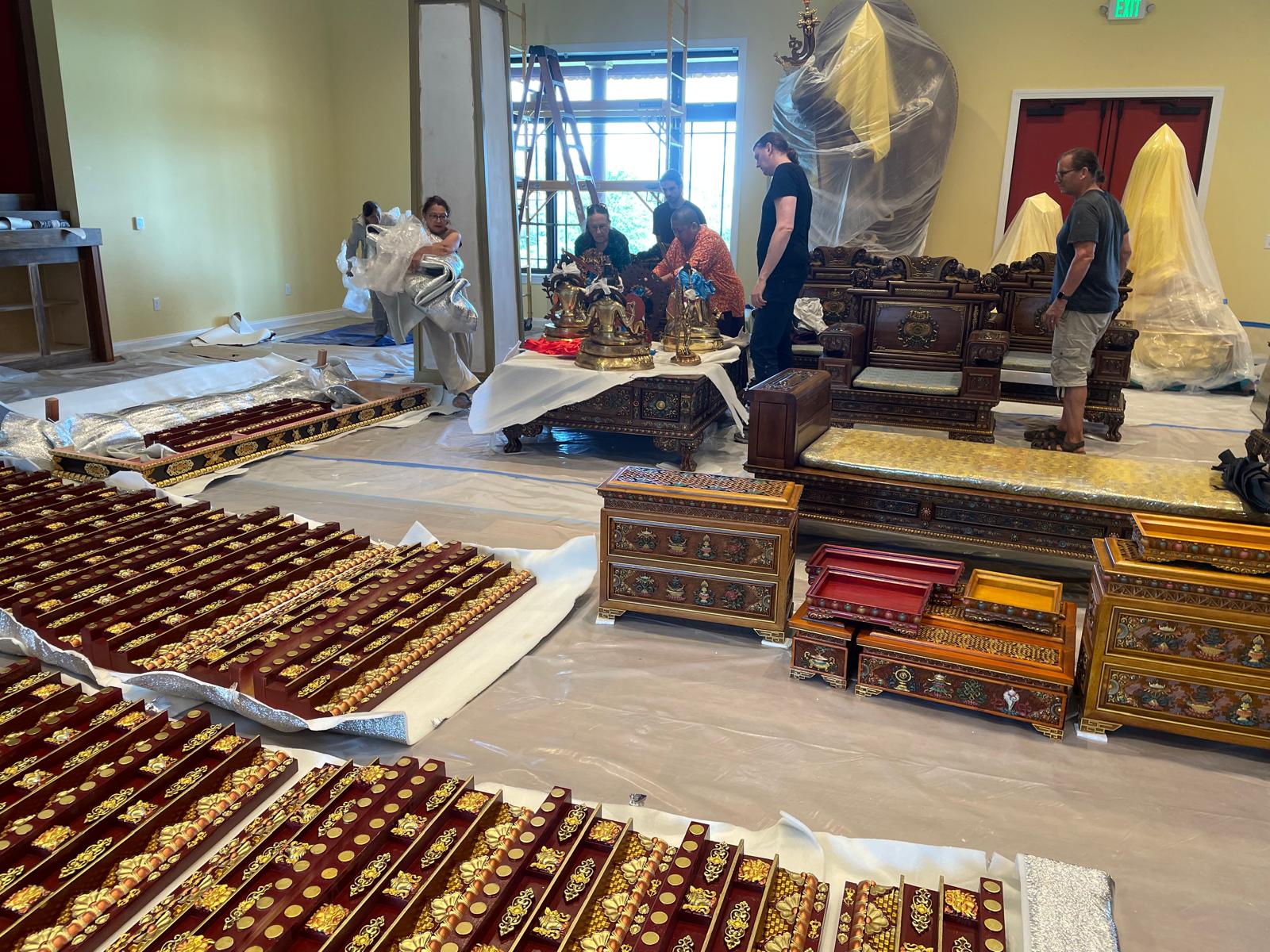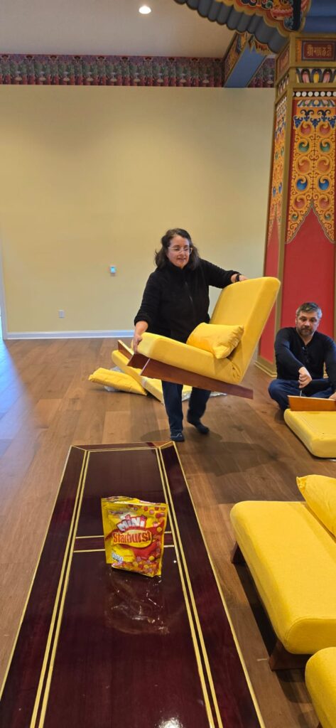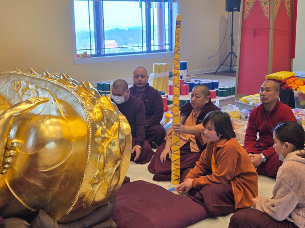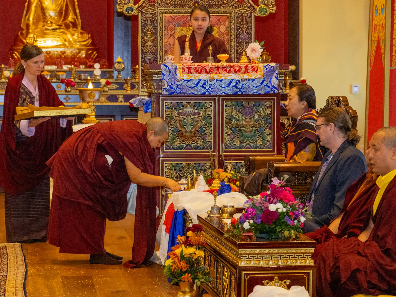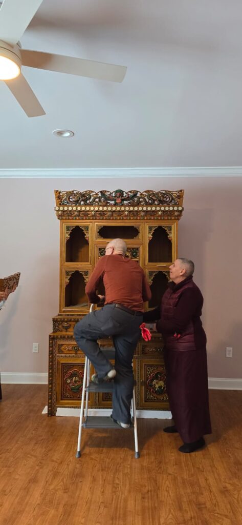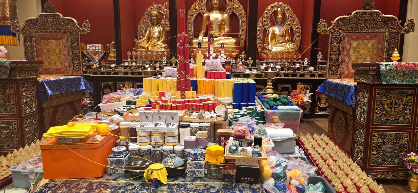 In November 2024, sangha members gathered in Minling Lotus Garden under the guidance of Minling Jetsün Khandro Rinpoche and Minling Jetsün Dechen Paldrön to continue working to bring the new temple to completion. Within a matter of days, the temple was cleaned thoroughly and transformed into a sacred environment. The statues of Buddha Shakyamuni, Guru Rinpoche, Chögyal Terdag Lingpa, and Kyabje Minling Trichen were prepared for filling, and the offerings, thrones, seats, and tables filled the shrine room for the first time as the victory banners and pillar ornaments were hung.