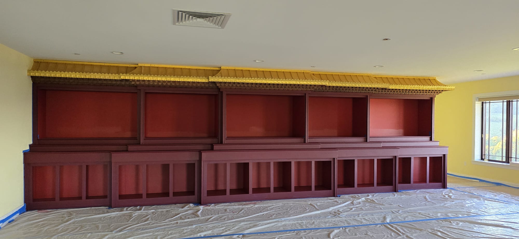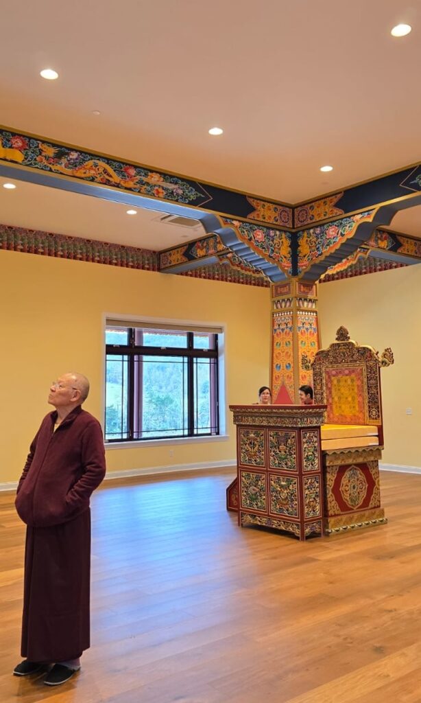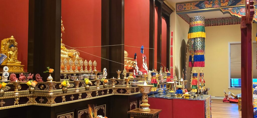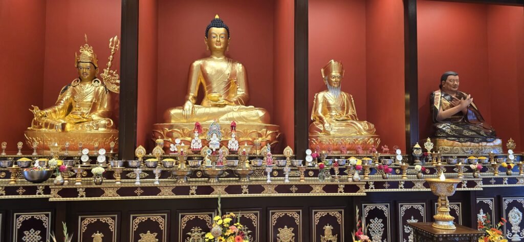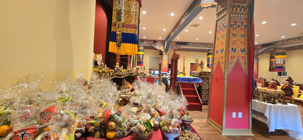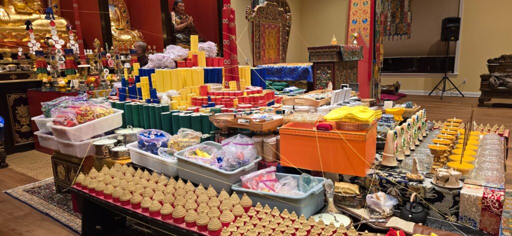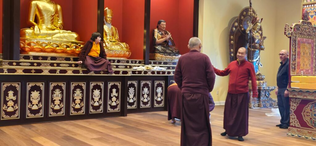 In November 2024, sangha members gathered in Minling Lotus Garden under the guidance of Minling Jetsün Khandro Rinpoche and Minling Jetsün Dechen Paldrön to continue working to bring the new temple to completion. Within a matter of days, the temple was cleaned thoroughly and transformed into a sacred environment. The statues of Buddha Shakyamuni, Guru Rinpoche, Chögyal Terdag Lingpa, and Kyabje Minling Trichen were prepared for filling, and the offerings, thrones, seats, and tables filled the shrine room for the first time as the victory banners and pillar ornaments were hung.