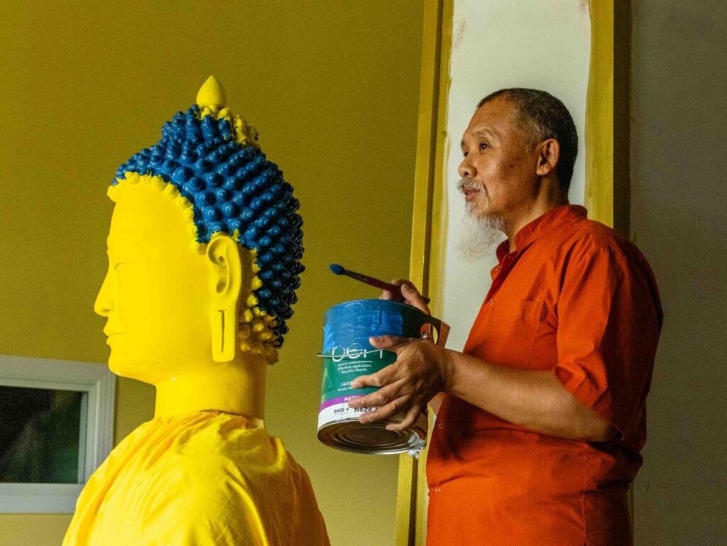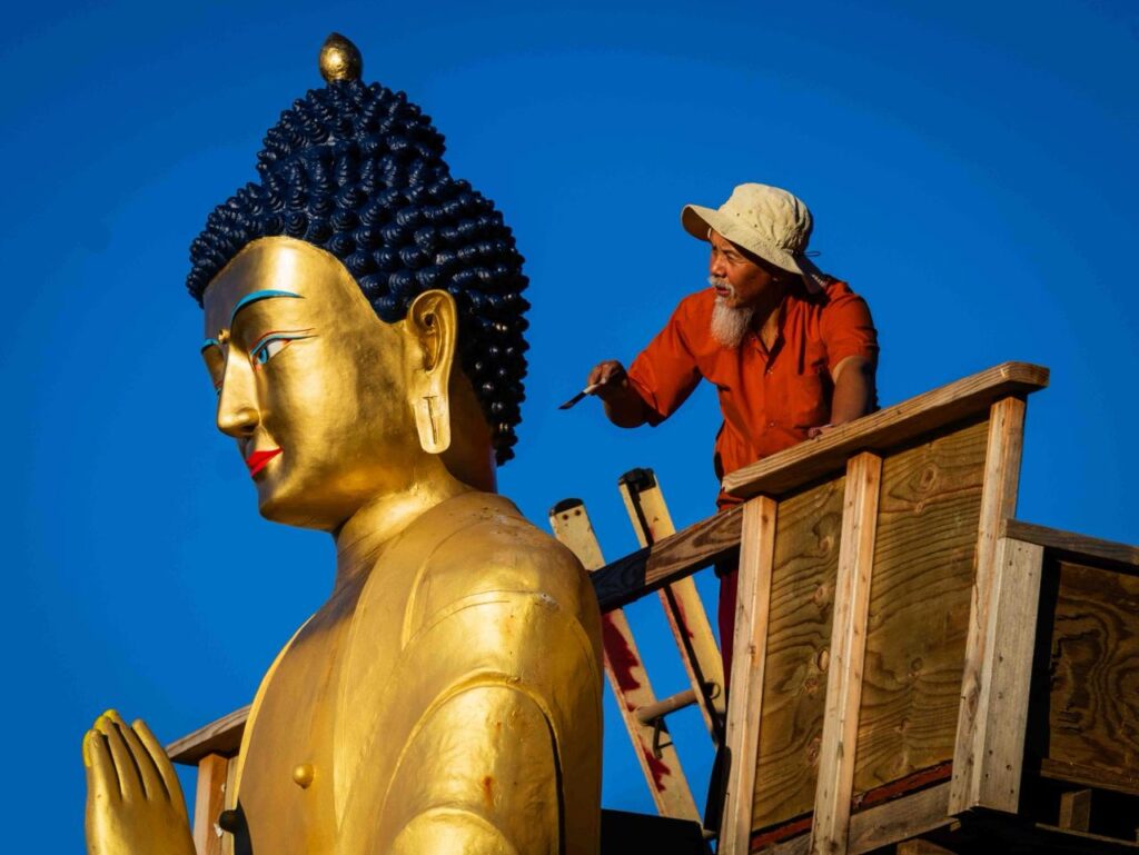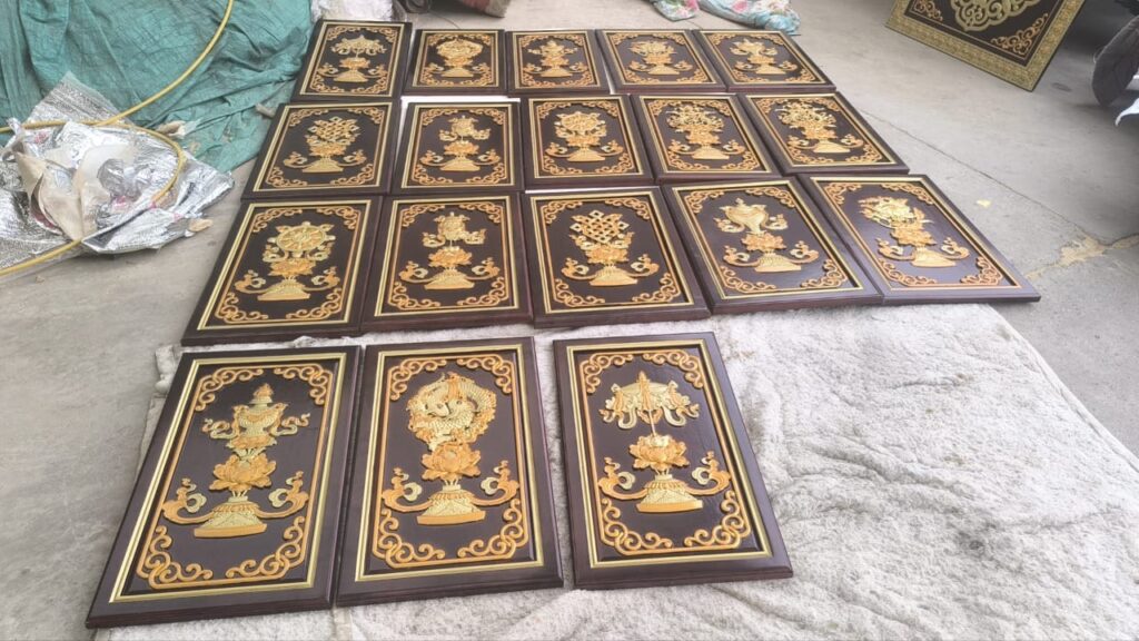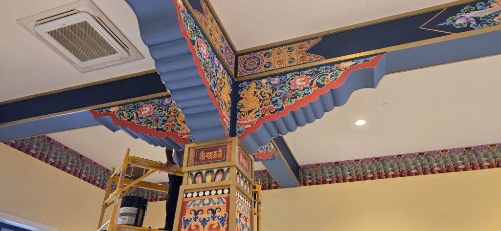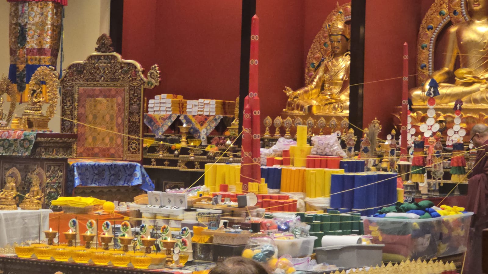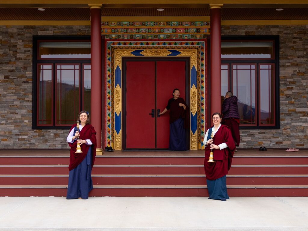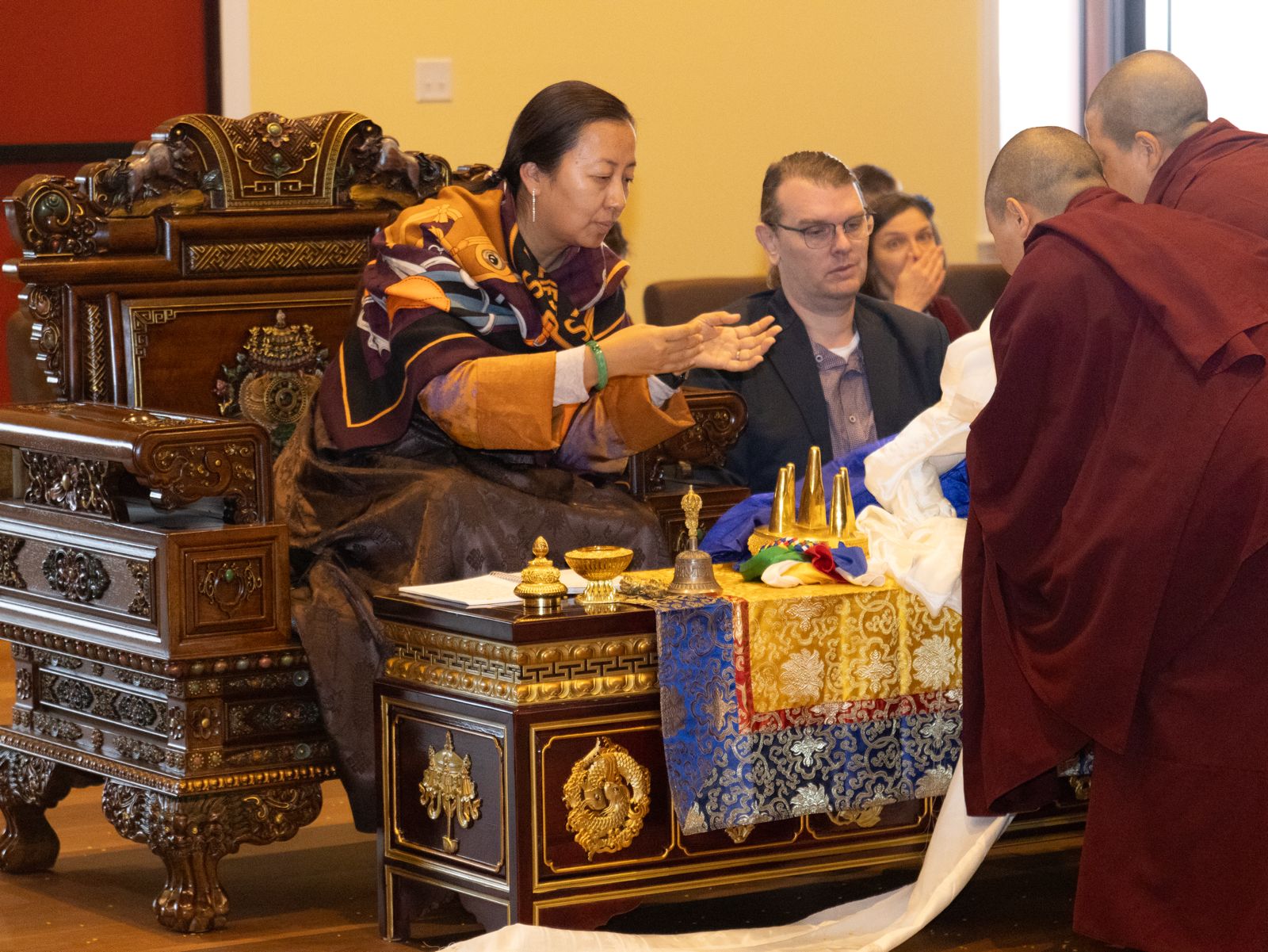 In November 2024, sangha members gathered in Minling Lotus Garden under the guidance of Minling Jetsün Khandro Rinpoche and Minling Jetsün Dechen Paldrön to continue working to bring the new temple to completion. Within a matter of days, the temple was cleaned thoroughly and transformed into a sacred environment. The statues of Buddha Shakyamuni, Guru Rinpoche, Chögyal Terdag Lingpa, and Kyabje Minling Trichen were prepared for filling, and the offerings, thrones, seats, and tables filled the shrine room for the first time as the victory banners and pillar ornaments were hung.
