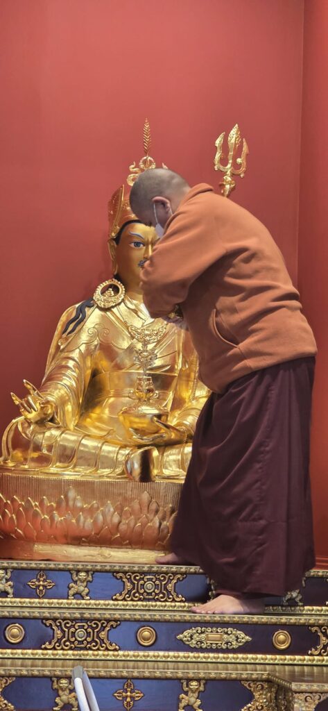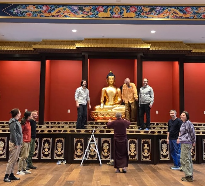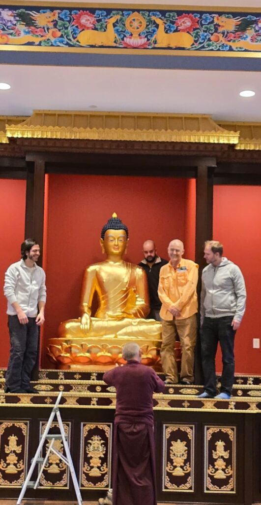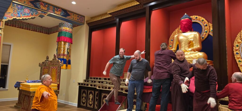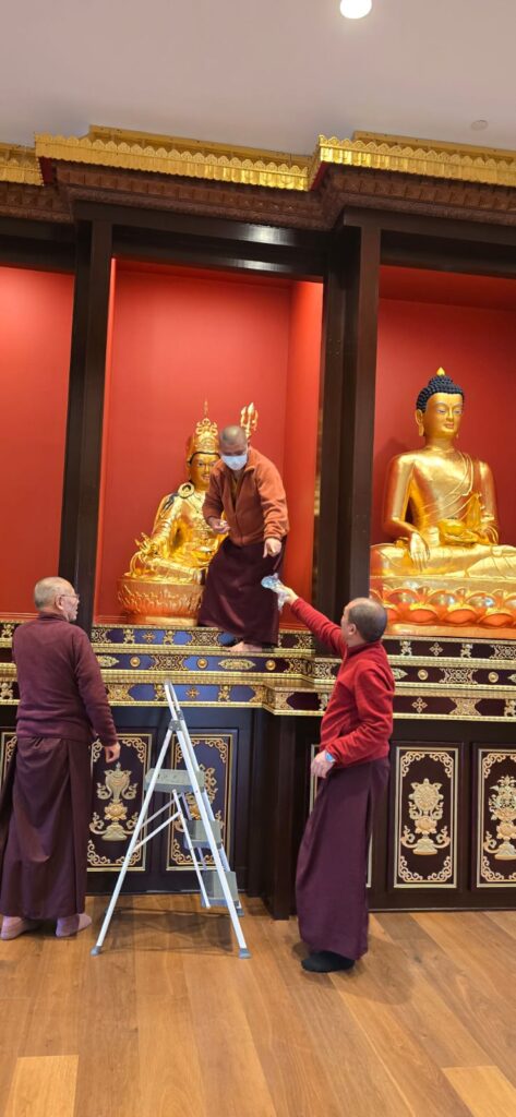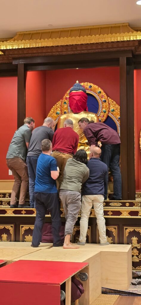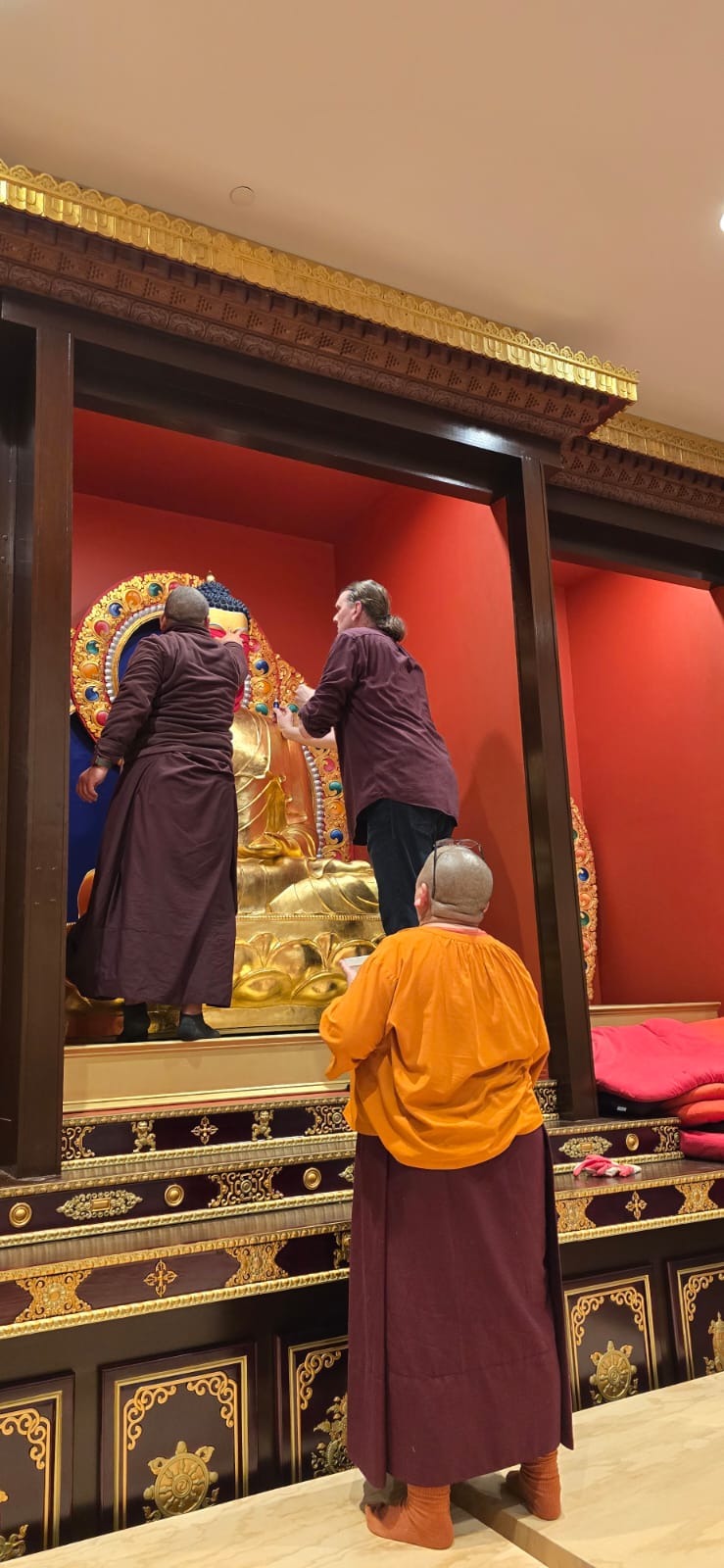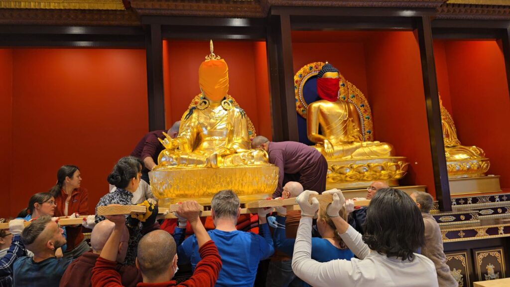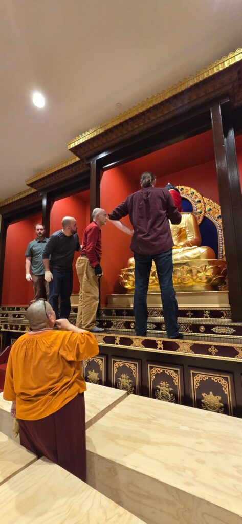 After midnight, in the early hours of the full moon day, the 13th of January 2025, everyone gathered to place the newly filled statue of Shakyamuni Buddha, its weight estimated close to a thousand pounds and place it on its throne in the main shrine. The room was filled with anticipation, and precise coordination and mindfulness would be essential for this important moment. Invoking the blessings of the three jewels and three roots, Rinpoche directed the entire process and after a few minutes, with all those gathered acting as one body under the command of the guru, the Buddha Shakyamuni was seated on the central throne. The remaining statues then followed one by one and by the next day all five had been placed on their respective thrones.