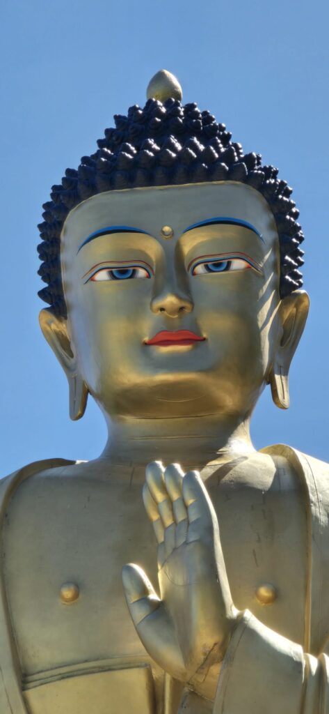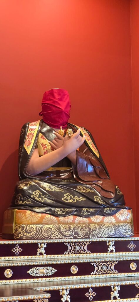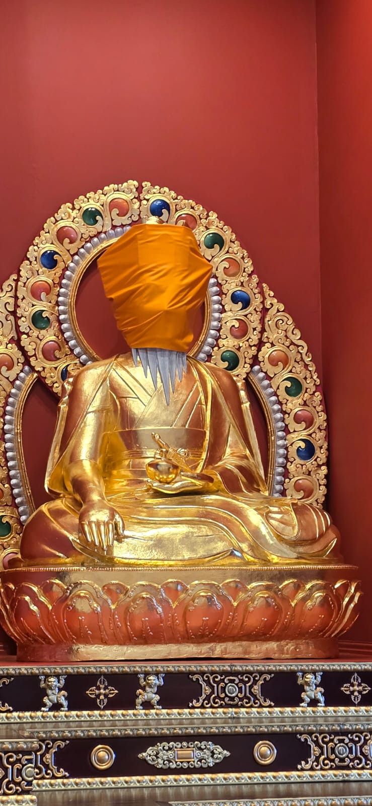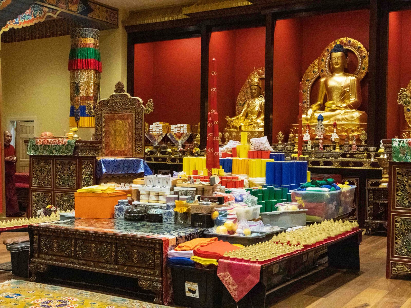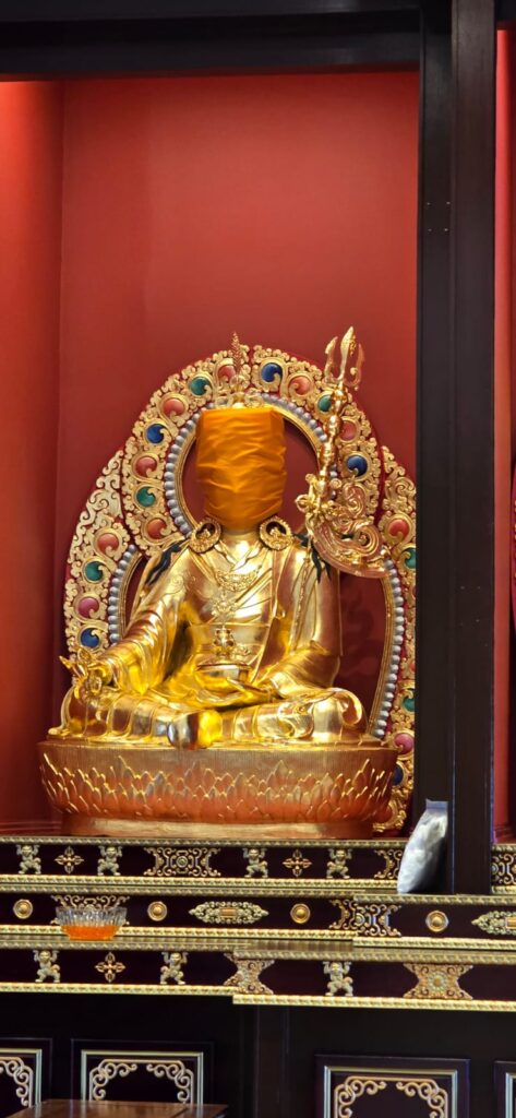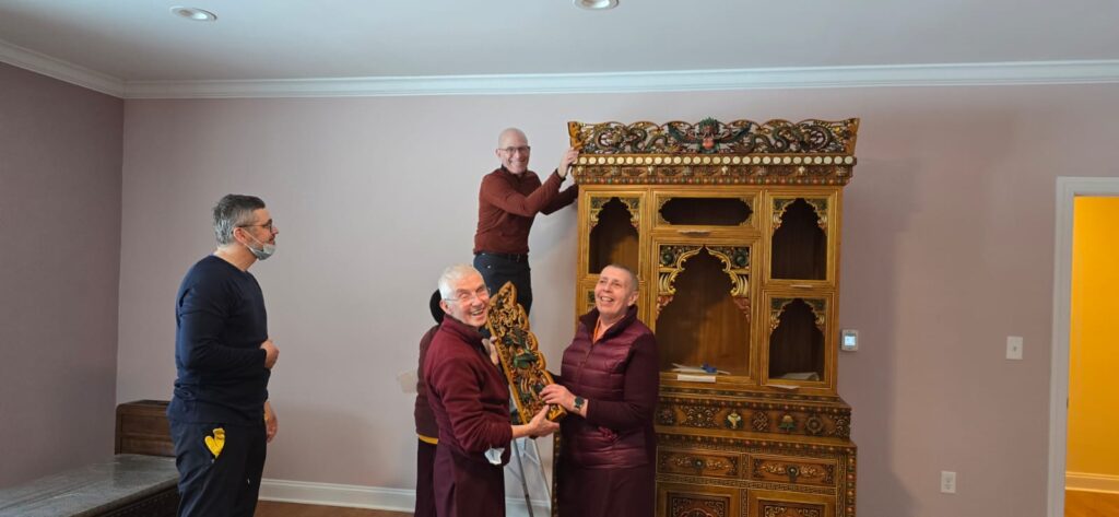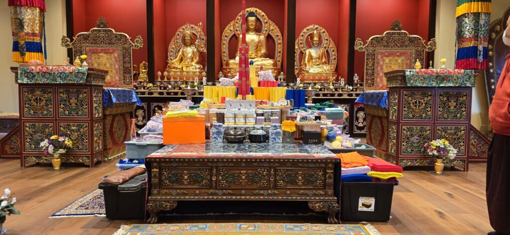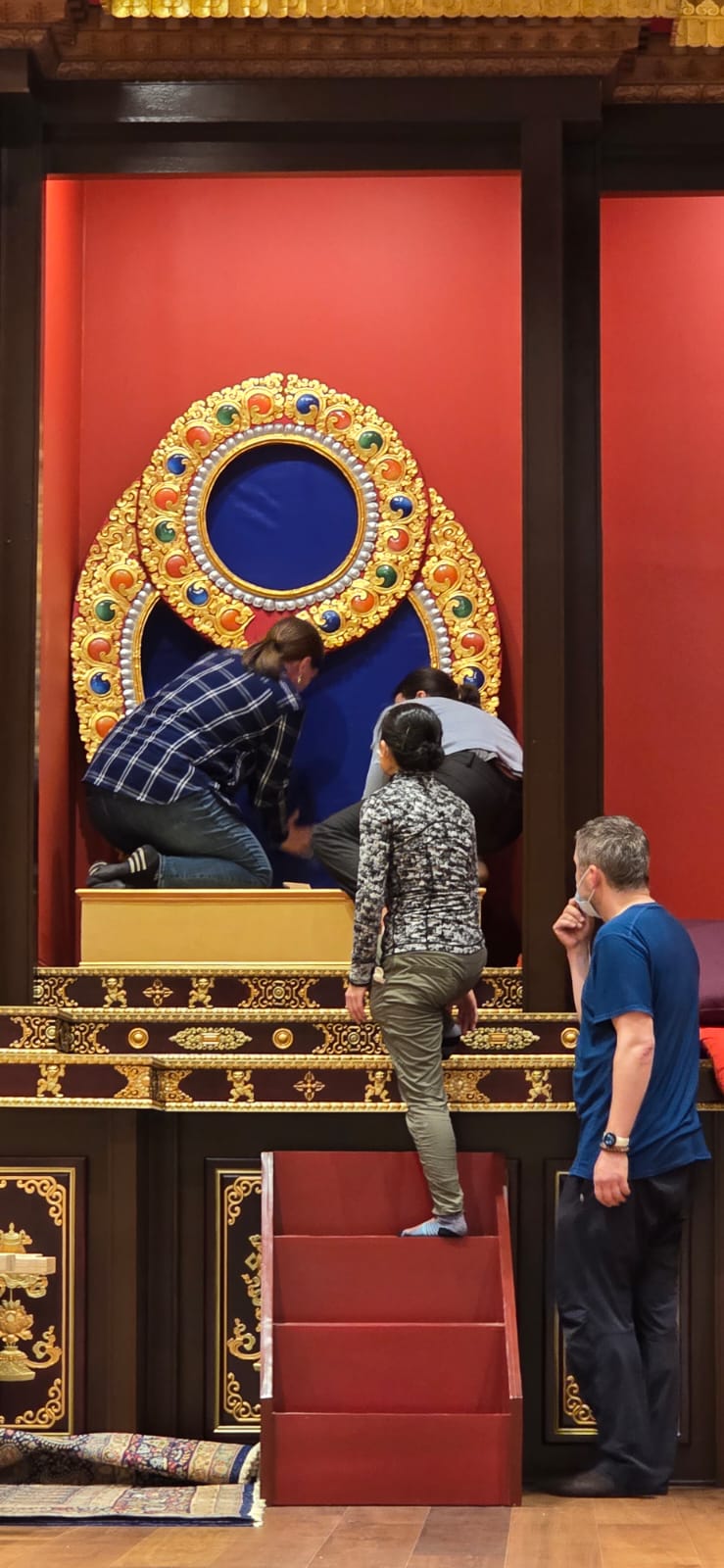After midnight, in the early hours of the full moon day, the 13th of January 2025, everyone gathered to place the newly filled statue of Shakyamuni Buddha, its weight estimated close to a thousand pounds and place it on its throne in the main shrine. The room was filled with anticipation, and precise coordination and mindfulness would be essential for this important moment. Invoking the blessings of the three jewels and three roots, Rinpoche directed the entire process and after a few minutes, with all those gathered acting as one body under the command of the guru, the Buddha Shakyamuni was seated on the central throne. The remaining statues then followed one by one and by the next day all five had been placed on their respective thrones.