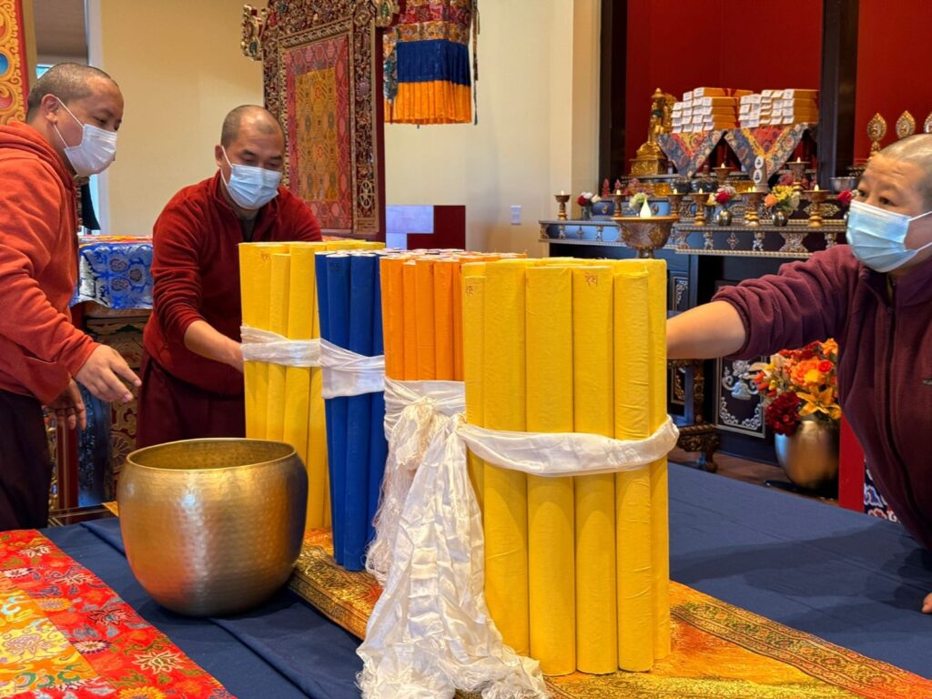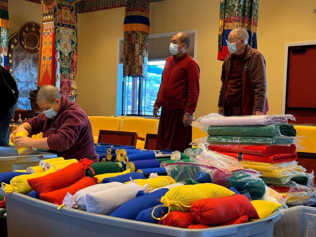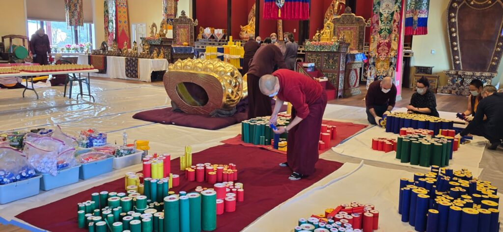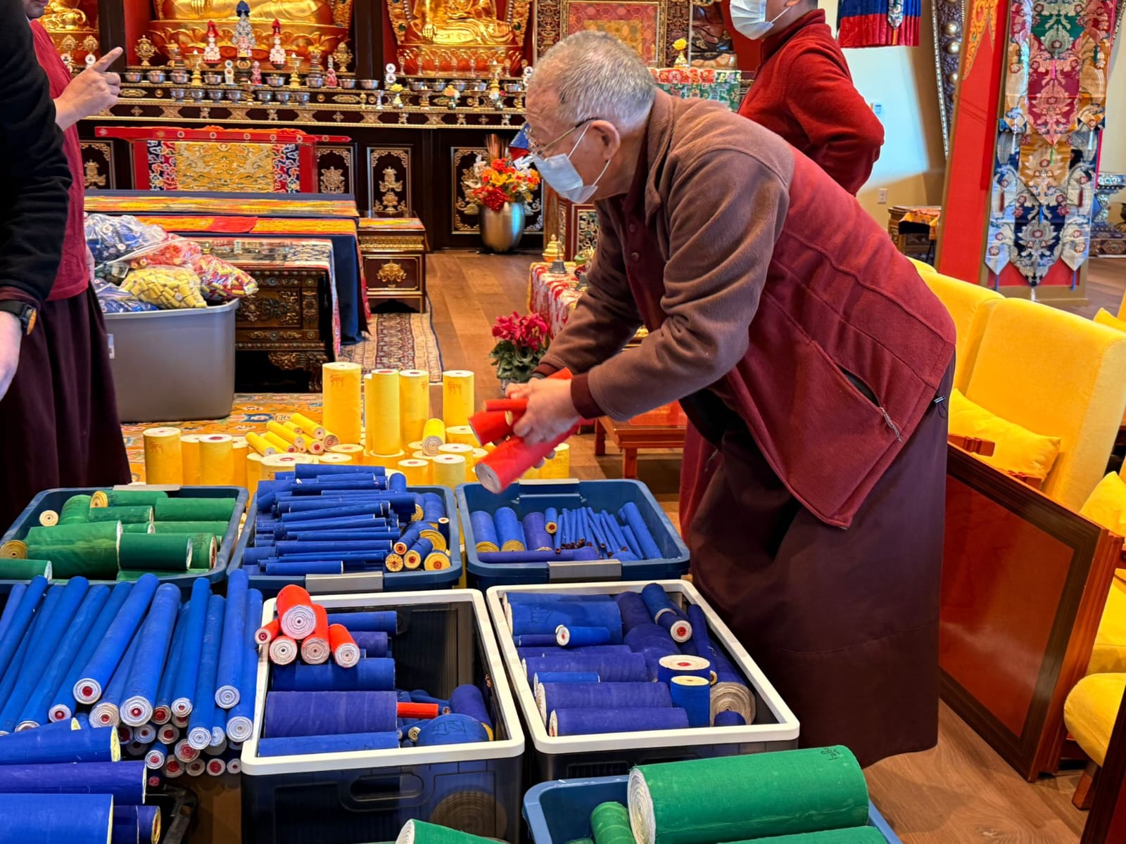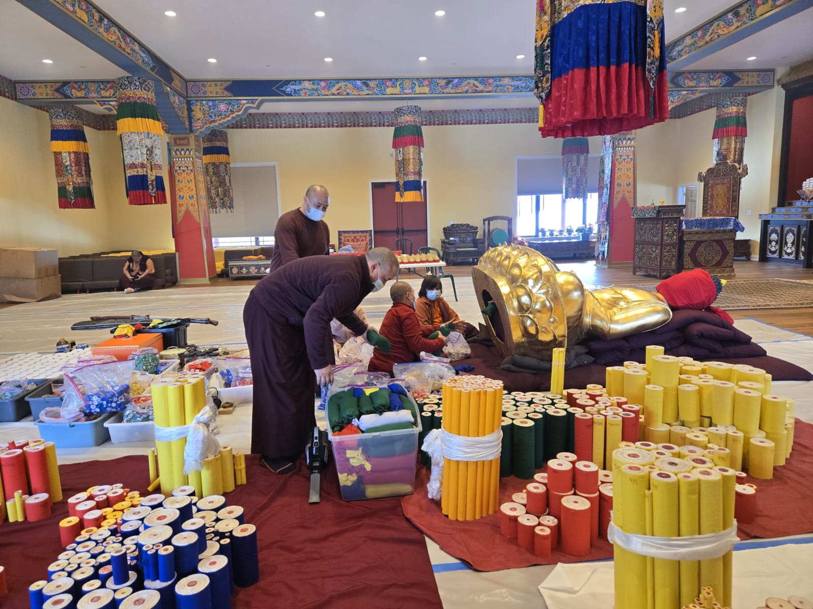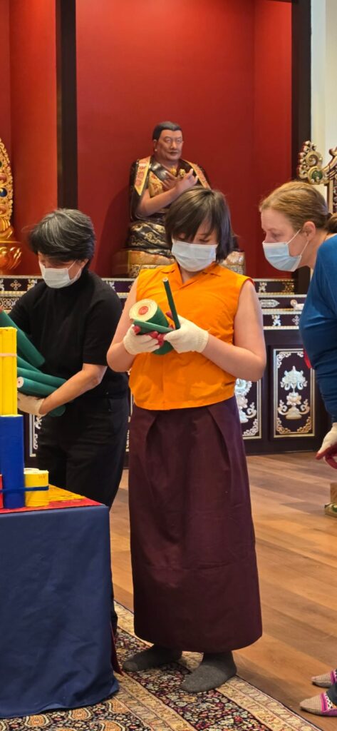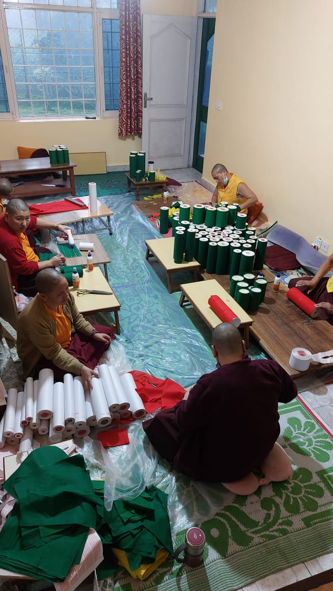 For the past year, the nuns of Samten Tse have been preparing much of the zung for the statues for Mindrol Gatsal. To prepare them, the dharanis are first washed with saffron water, cut, glued together and rolled into continuous rolls of unbroken mantras. Finally, they are adorned with cloths of the appropriate colors according to the mantra. The Samten Tse nuns prepared over 750 kg of zung which was shipped from India to the United States. This work was then continued in Lotus Garden, as further zung was prepared by the Mindrol Lekshey students under the supervision of our teachers and senior monks and nuns.