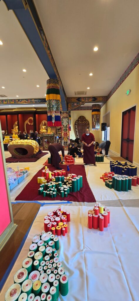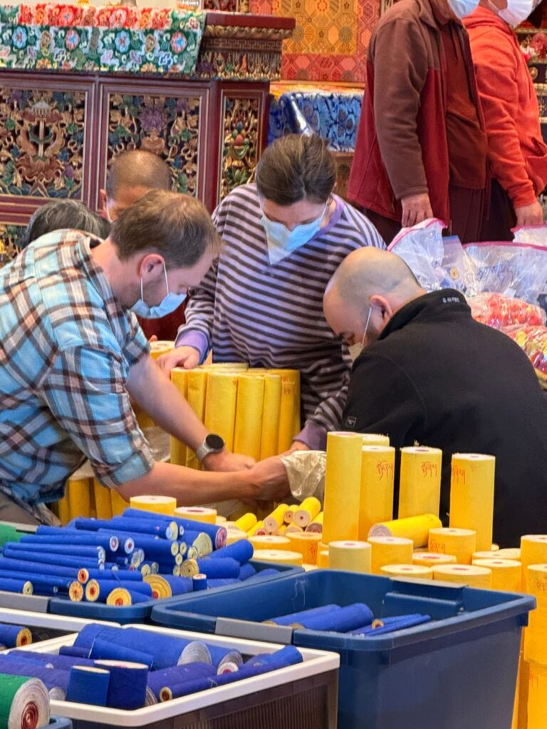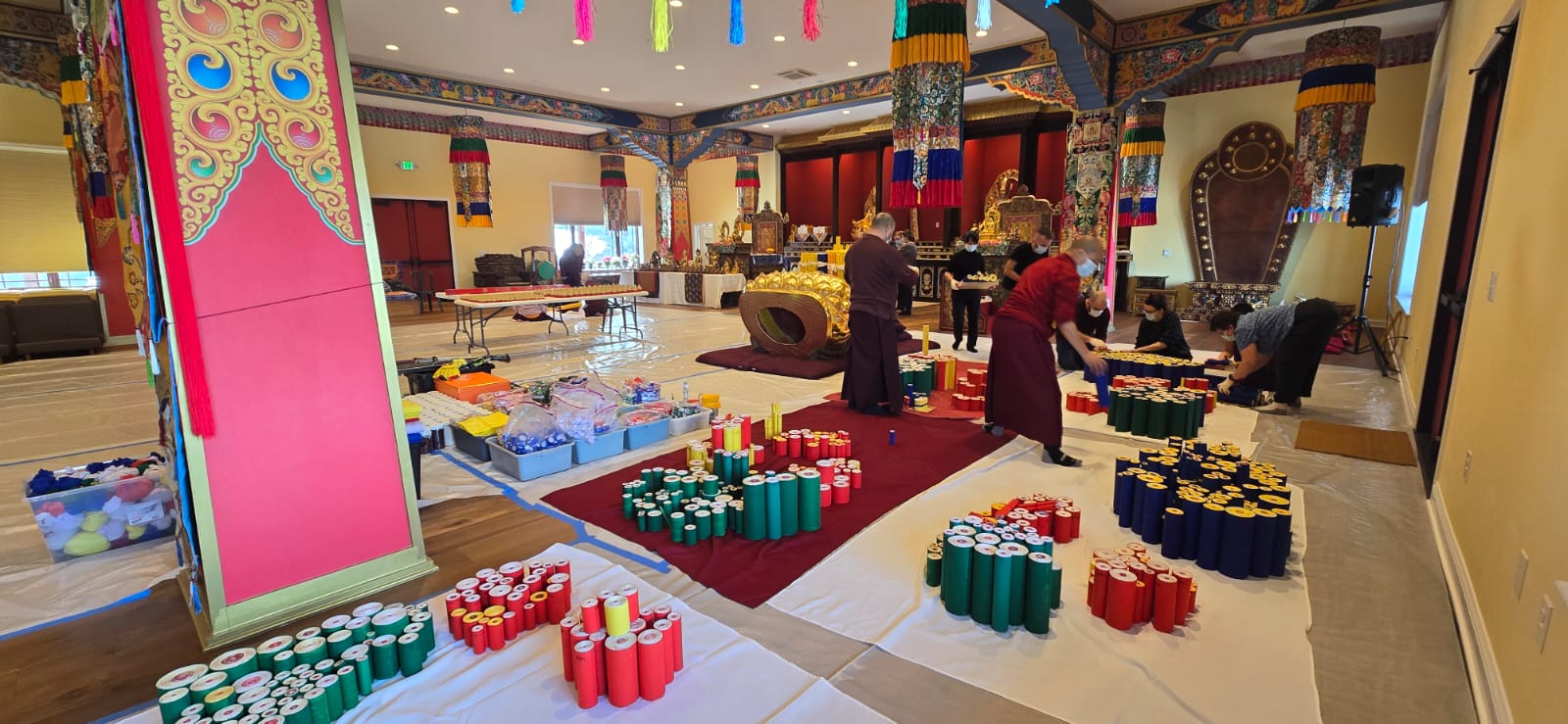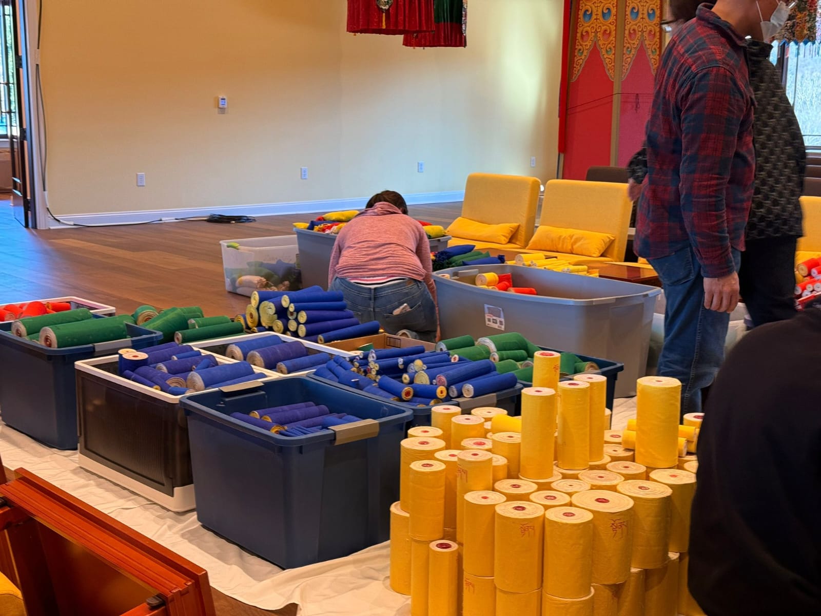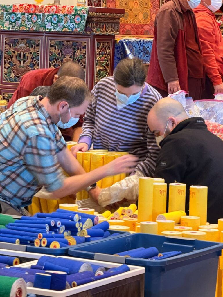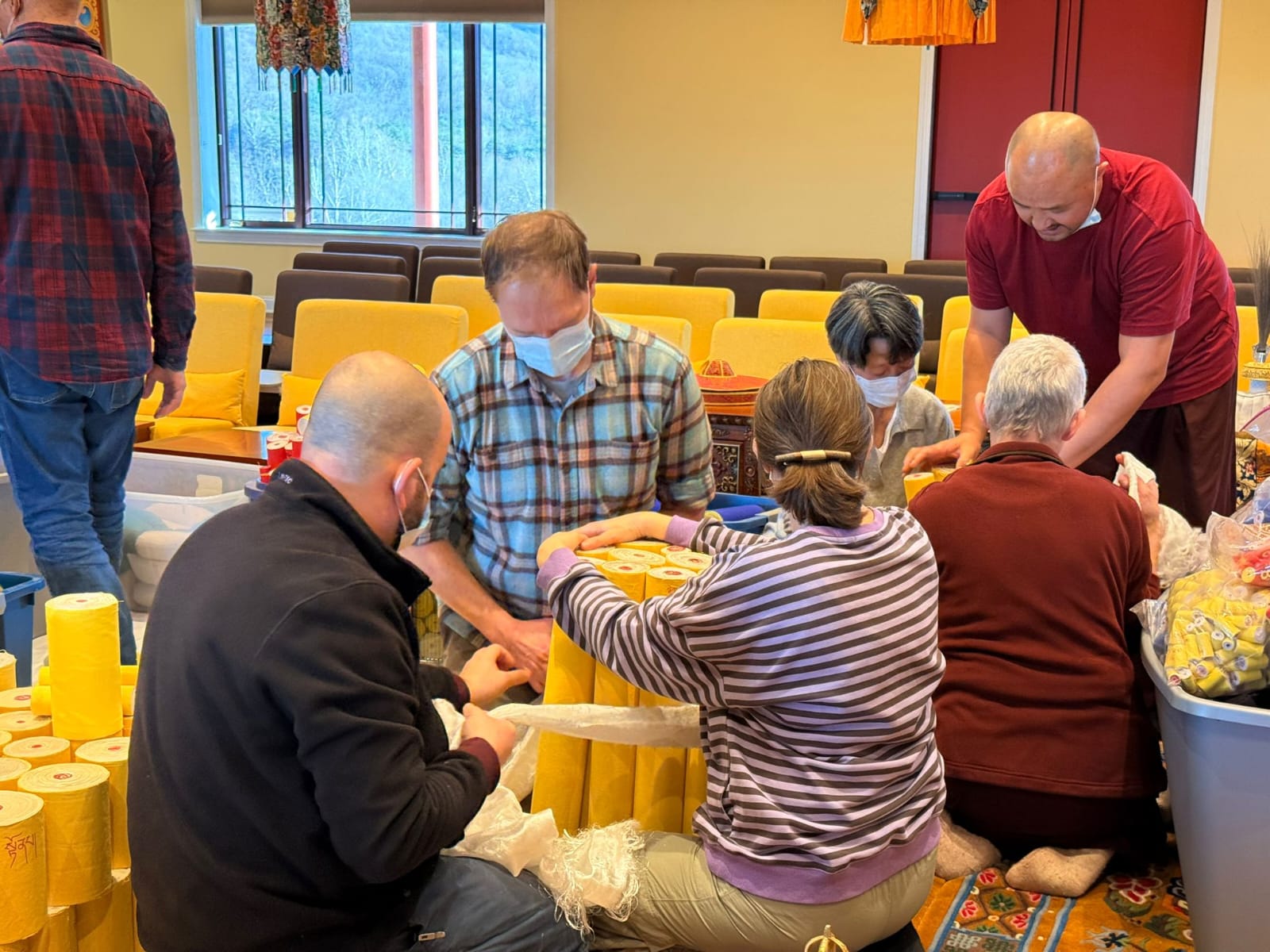 For the past year, the nuns of Samten Tse have been preparing much of the zung for the statues for Mindrol Gatsal. To prepare them, the dharanis are first washed with saffron water, cut, glued together and rolled into continuous rolls of unbroken mantras. Finally, they are adorned with cloths of the appropriate colors according to the mantra. The Samten Tse nuns prepared over 750 kg of zung which was shipped from India to the United States. This work was then continued in Lotus Garden, as further zung was prepared by the Mindrol Lekshey students under the supervision of our teachers and senior monks and nuns.