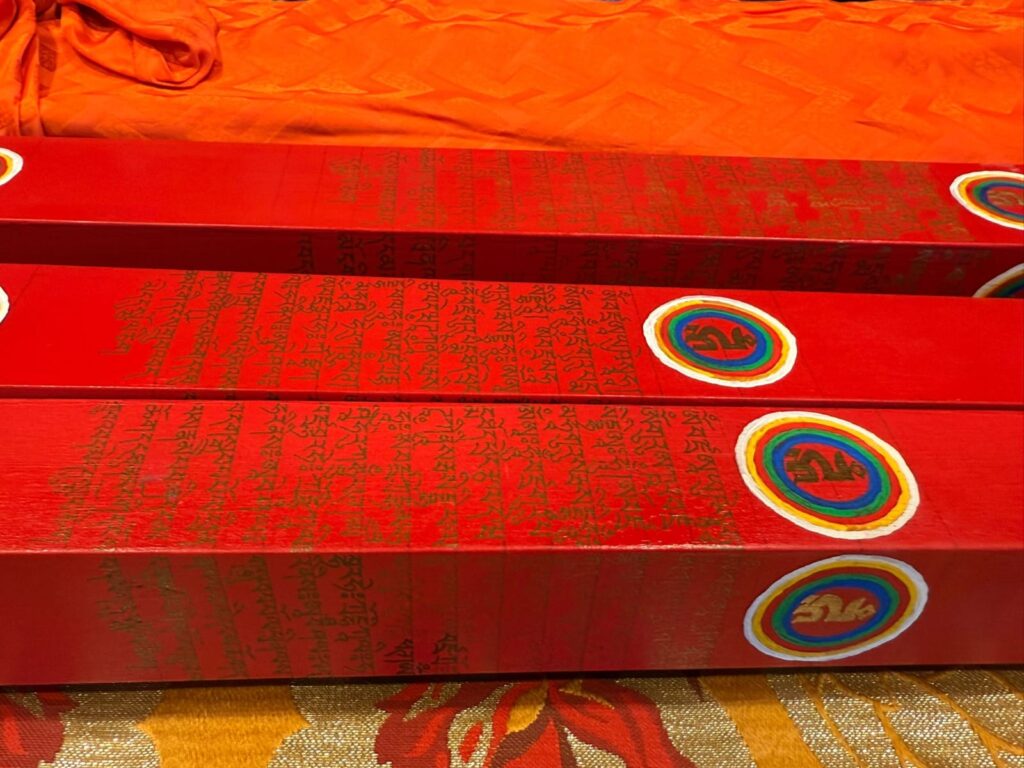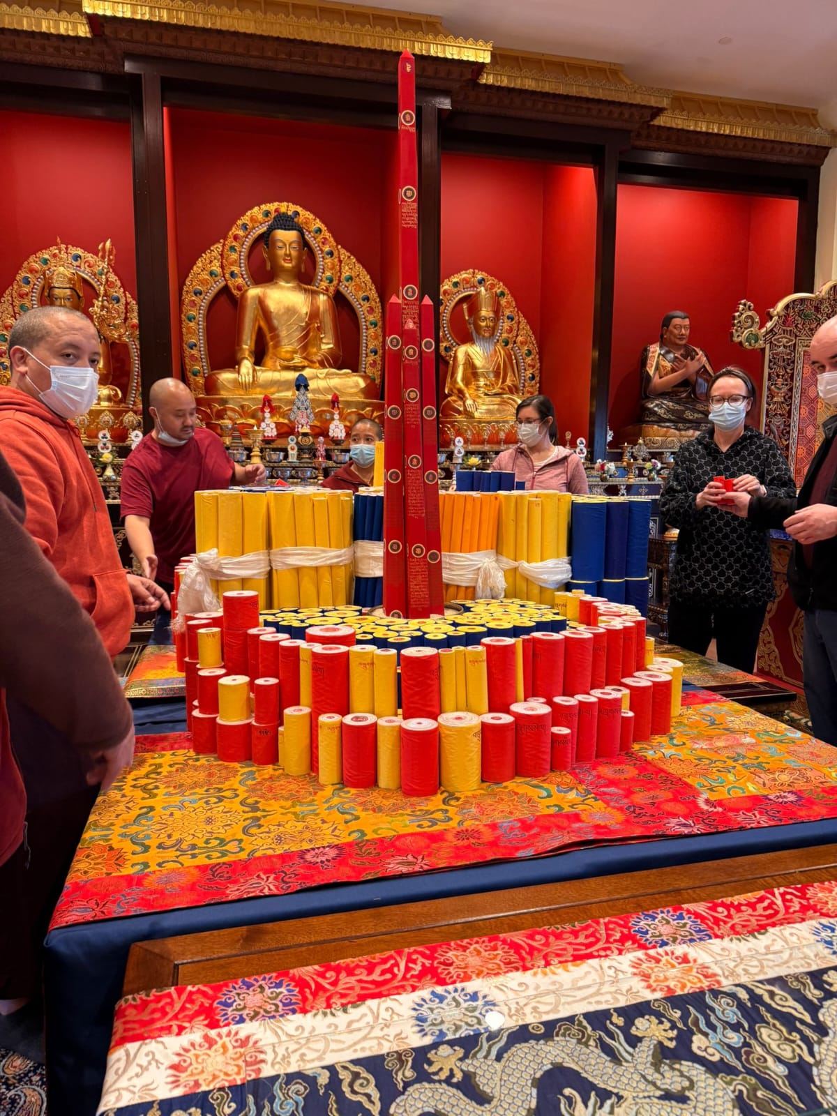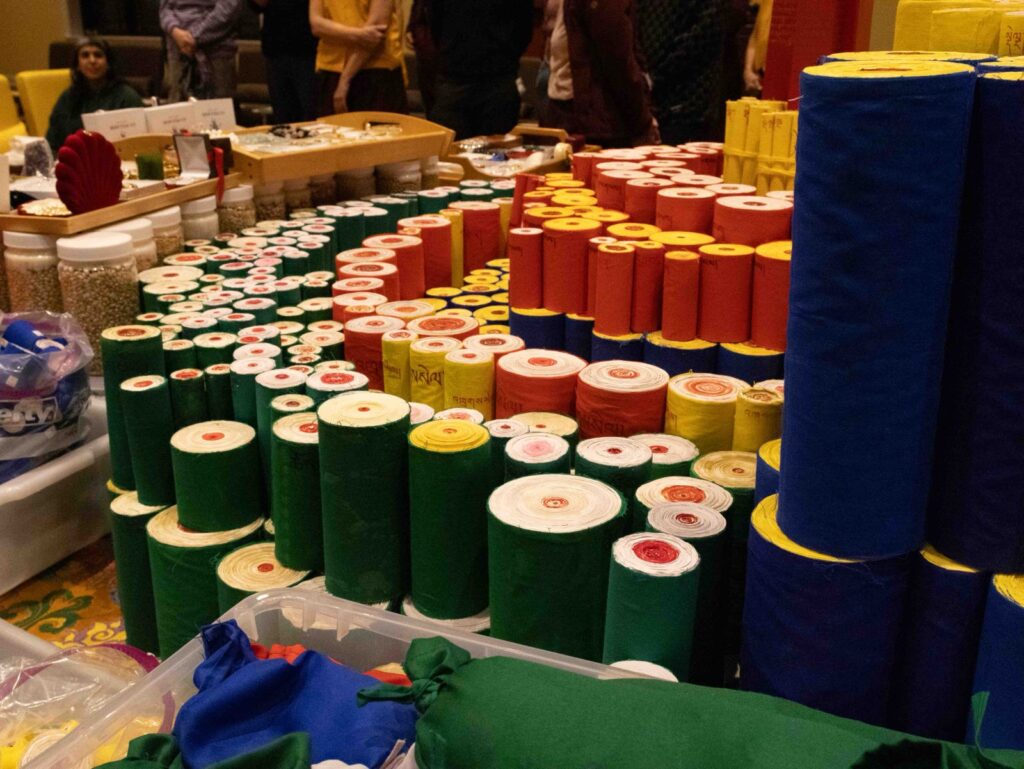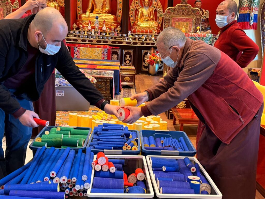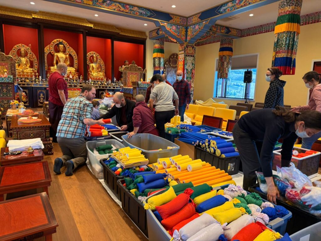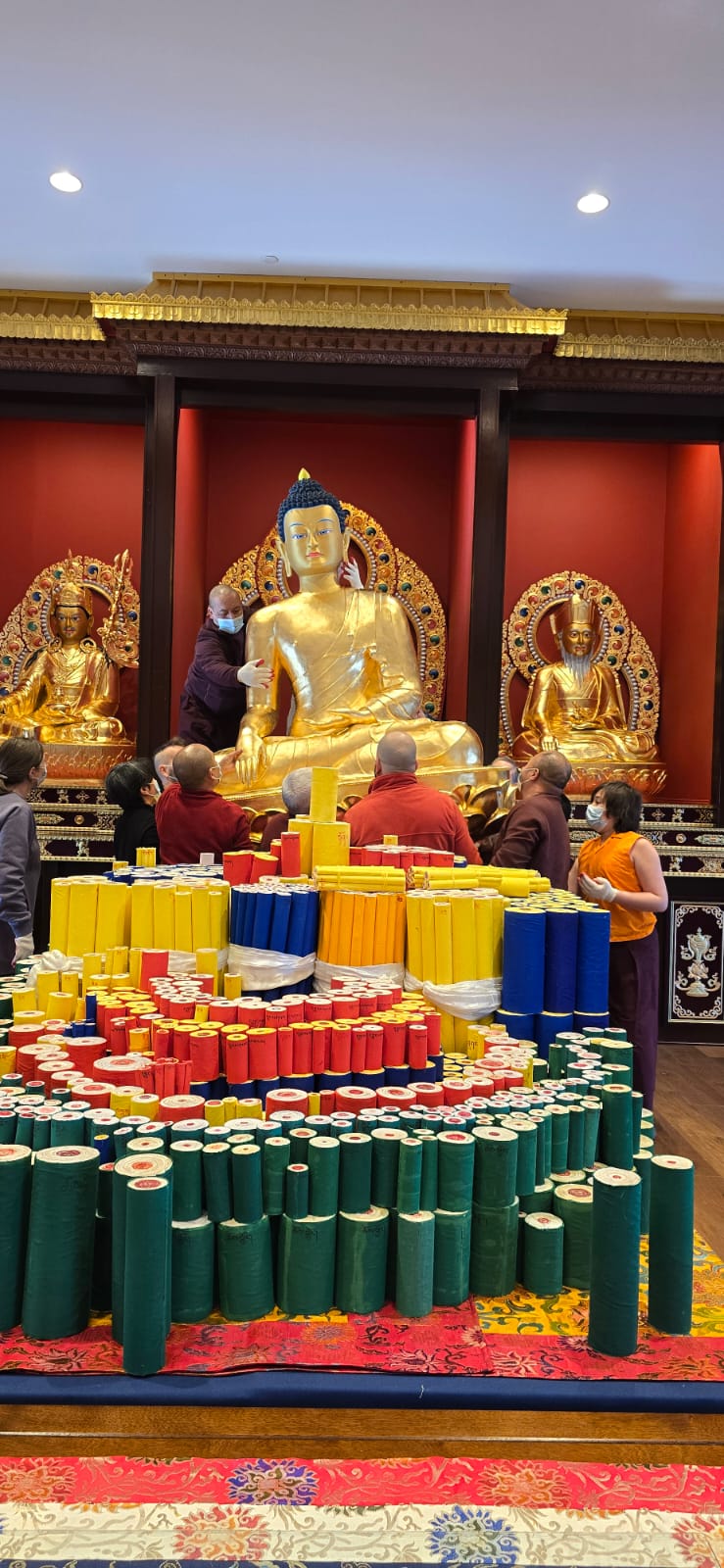 For the past year, the nuns of Samten Tse have been preparing much of the zung for the statues for Mindrol Gatsal. To prepare them, the dharanis are first washed with saffron water, cut, glued together and rolled into continuous rolls of unbroken mantras. Finally, they are adorned with cloths of the appropriate colors according to the mantra. The Samten Tse nuns prepared over 750 kg of zung which was shipped from India to the United States. This work was then continued in Lotus Garden, as further zung was prepared by the Mindrol Lekshey students under the supervision of our teachers and senior monks and nuns.