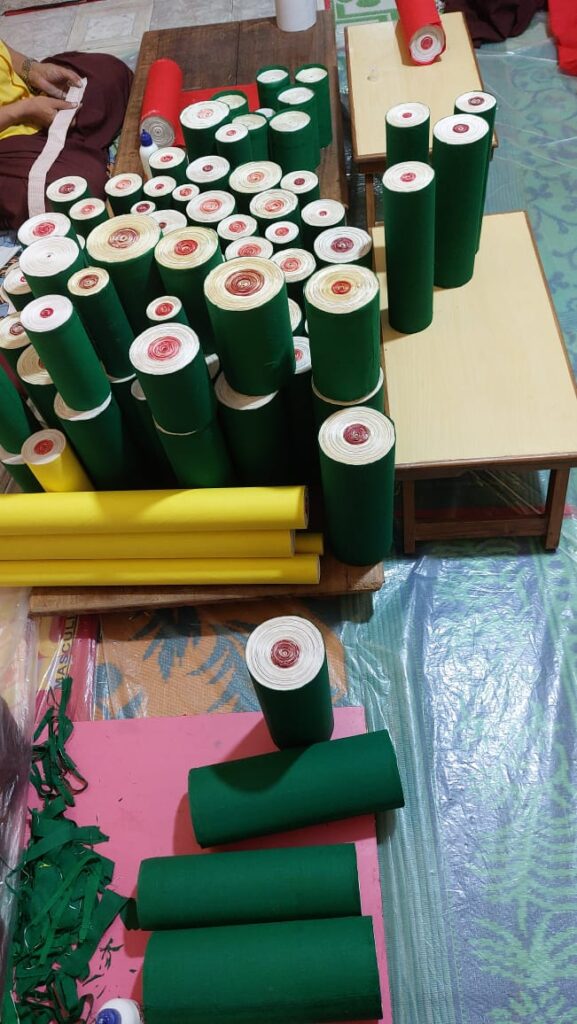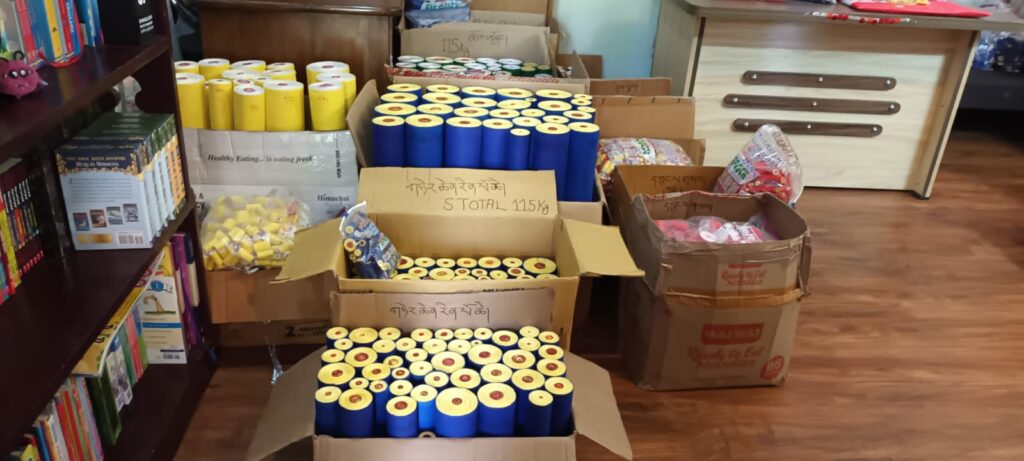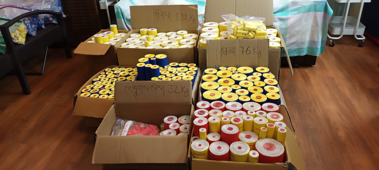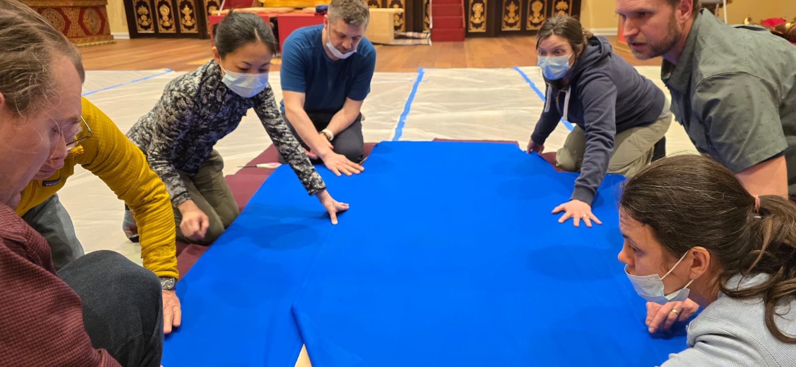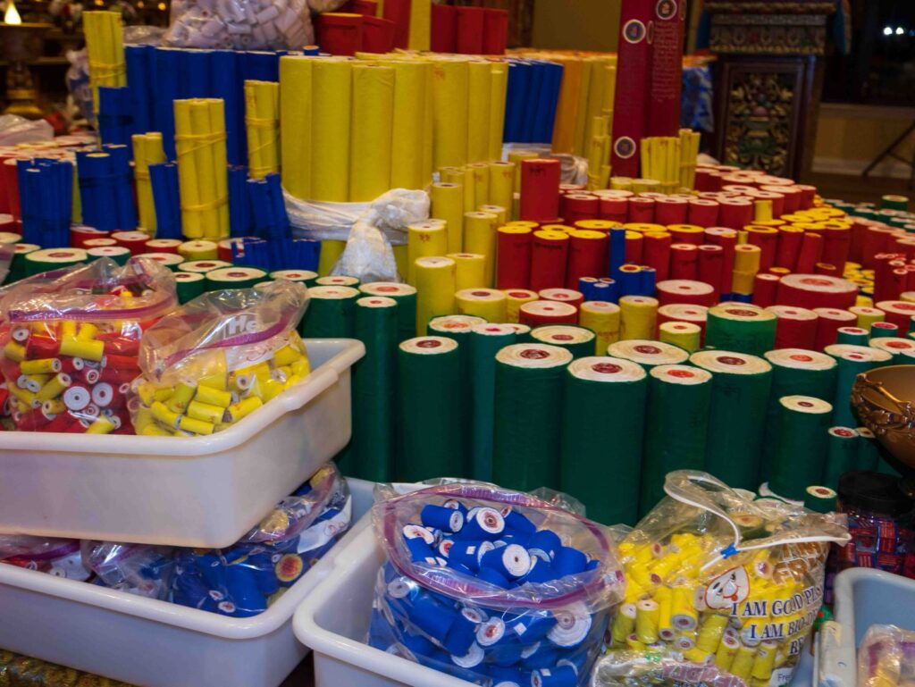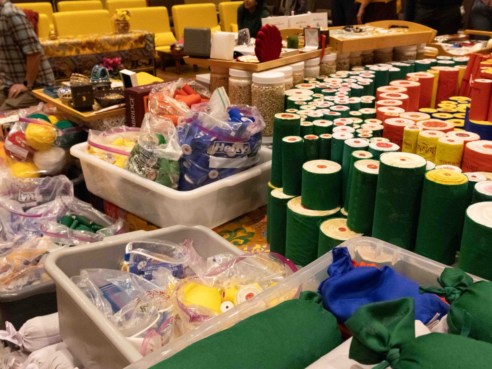For the past year, the nuns of Samten Tse have been preparing much of the zung for the statues for Mindrol Gatsal. To prepare them, the dharanis are first washed with saffron water, cut, glued together and rolled into continuous rolls of unbroken mantras. Finally, they are adorned with cloths of the appropriate colors according to the mantra. The Samten Tse nuns prepared over 750 kg of zung which was shipped from India to the United States. This work was then continued in Lotus Garden, as further zung was prepared by the Mindrol Lekshey students under the supervision of our teachers and senior monks and nuns.