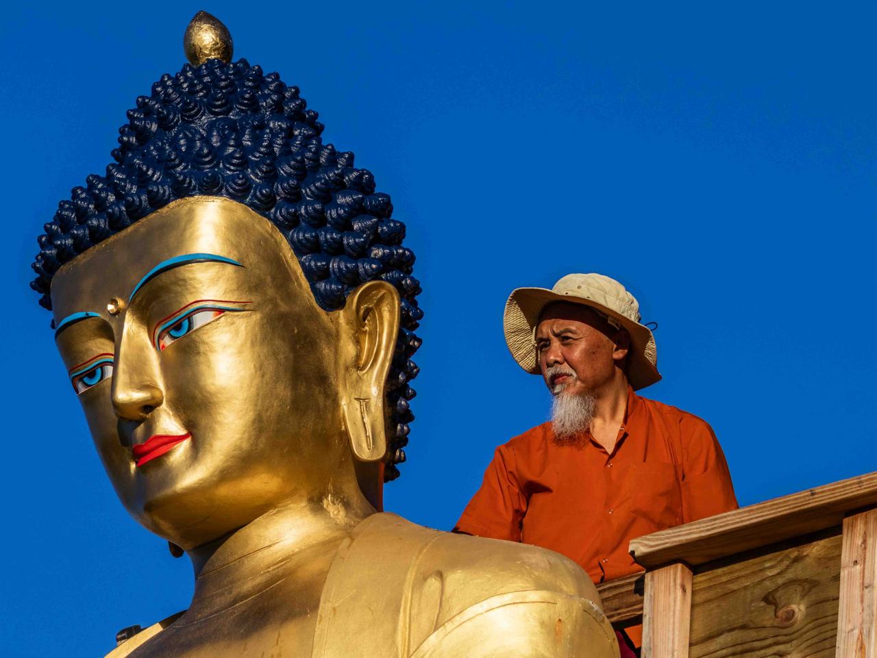 At the core of every statue is the sog shing or life force tree. Carved from a juniper tree from our blessed land of Lotus Garden, each of the sog shing was made on site by the skilled hands of senior Mindrolling monks. The sog shing were carved, dried, painted, and inscribed with the sacred syllables and mantras in gold paint.