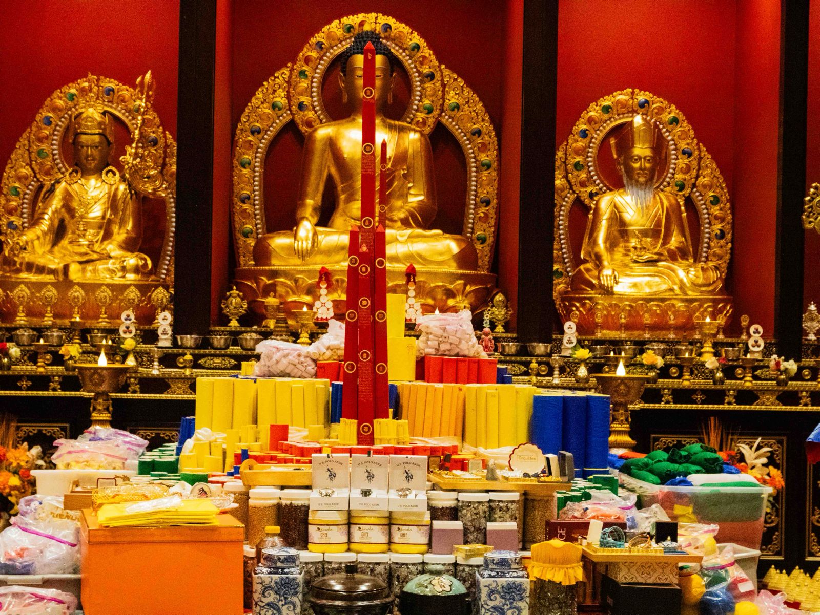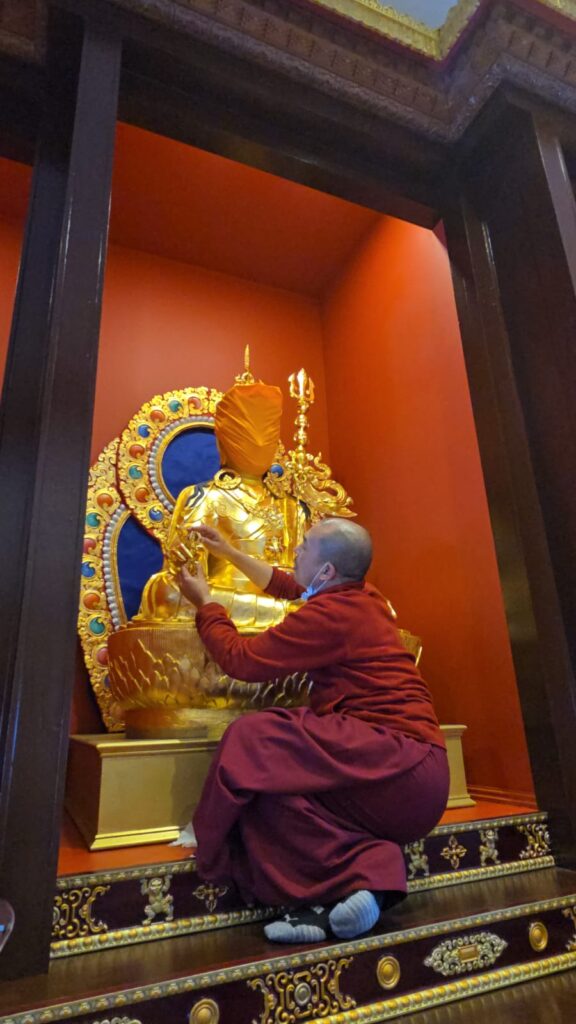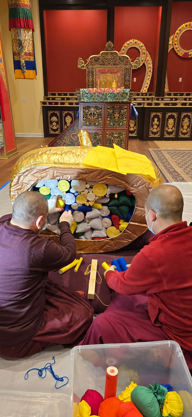 After the statues had been filled and sealed, final applications of gold were offered by the Mindrolling monks. Gold thrones and the rainbow-colored ornaments were placed in the shrine to prepare for the statues to take their seats in Mindrol Gatsal.