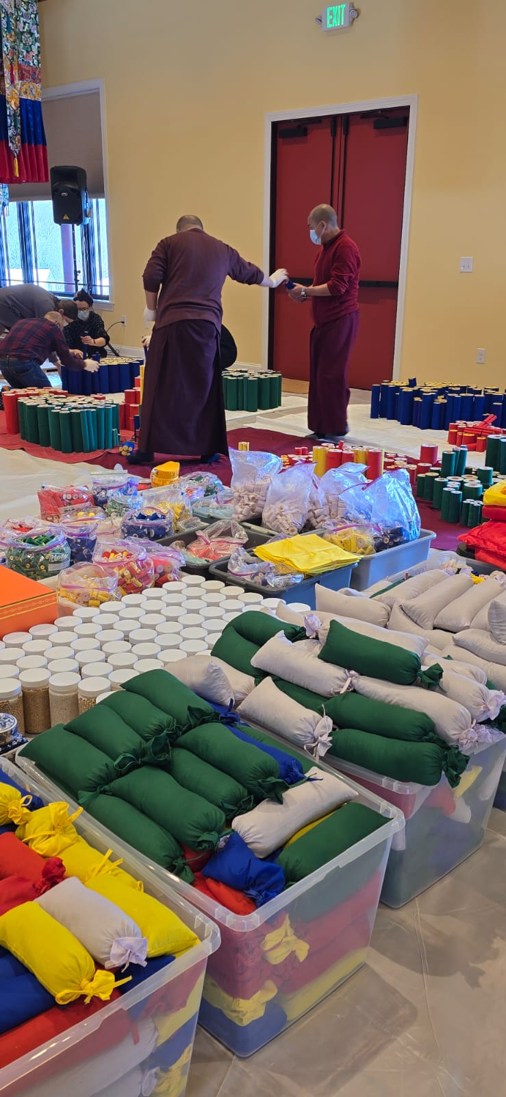 Dharanis constitute the main part of the filling of the statue, but as specified in the works of the great Lochen Dharmashri, various other substances are needed. Relics, blessing pills, and various valuable and medicinal substances are among them. The 5 grains, the 5 five nectars, medicinal herbs, the 5 fragrances, cloths, precious substances of various spices and grains, the three kinds of fruits, precious jewels, dry fruits, nuts, and fragrant boughs such as juniper are all required, and each one holds specific meaning and symbolism. All offerings were gathered in great quantities of the highest quality the washed, dried, and wrapped in five colored cloths and other containers to be placed in the statues. Hundreds of tsa tsa were made by the monks, nuns, and Lotus Garden residents to be placed inside the statues as well.