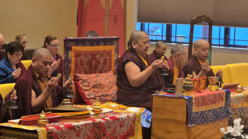 On the 22nd of November, the auspicious day of Saga Dawa and Minling Jetsun Dechen Paldon’s birthday coincided to make it a doubly precious day for the Mindrolling sangha. Rinpoche, Jetsünla, Minling Jetsün Rinpoche, Minling Dungse Rinpoche, monks of Mindrolling, nuns of Samten Tse, and Western Mindrolling sangha members all gathered in Mindrol Gatsal, the Joyous Garden of Ripening and Liberation, the newly named temple. This joyful gathering of the Mindrolling lineage and sangha of Mindrolling made extensive offerings, prayers and aspirations to mark the Buddha’s birth, enlightenment and parinirvana as well as the birthday of our teacher Jetsünla. It was a wonderful, auspicious first day for Mindrol Gatsal as a place of practice.