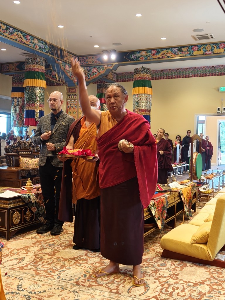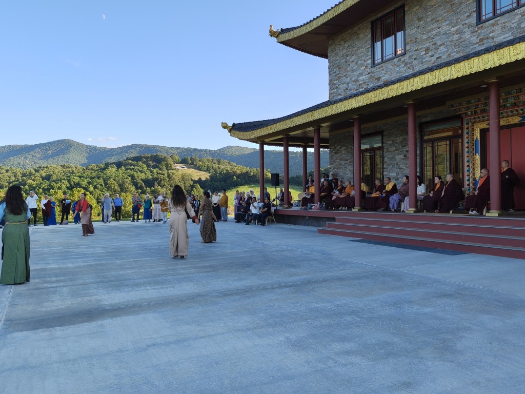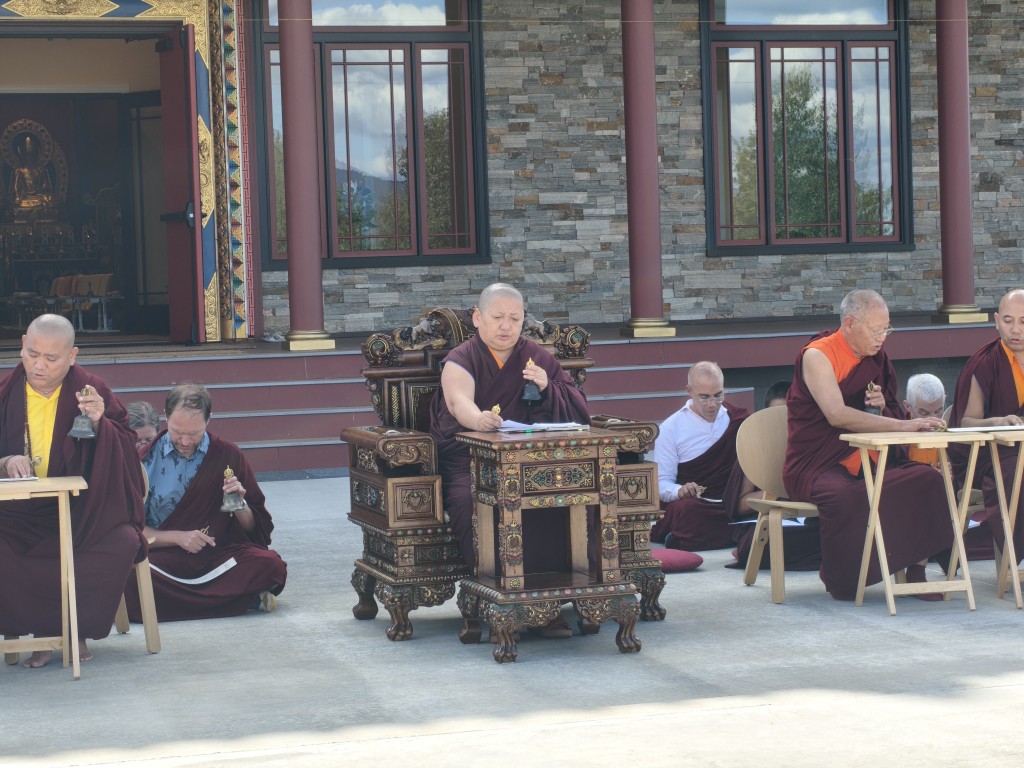 It was a wonderful celebration as the ritual was brought to conclusion. The gathered Rinpoches, monks, nuns, and lay practitioners practiced together in harmony and joined in the sincere aspiration that Mindrol Gatsal will be a place to hold and support the practice and transmission of the authentic Buddhadharma far into the future. The auspicious and joyful sedreng and blessing rituals were performed, and the entire environment blossomed fully with blessings and auspiciousness. This event marks an extraordinary landmark in the history of Mindrolling and the establishment of Mindrolling in the West. The vision of Mindrolling as the source of pure Dharma, a vessel for authentic and unadulterated transmissions, a place for deepened studies and practice, and wholehearted training manifested on the land of Pema Gatsal.