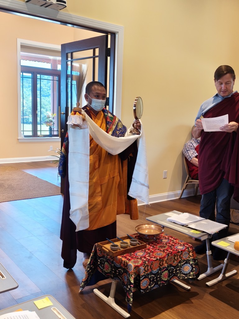 This most extensive rabne ritual, accomplished according to the tradition of Terdag Lingpa, comprised three days of intensive practice, beginning on the auspicious 8th lunar day of the 7th lunar month. Hundreds of sangha members joined in the ceremonies including over a hundred members of the local Virginia Tibetan community. The final day of the rabne fell on the auspicious Guru Rinpoche Day (the 10th lunar day), and to the great good fortune of the gathered assembly, His Eminence Dzigar Kongtrul Rinpoche presided over the rabne ritual on this auspicious.