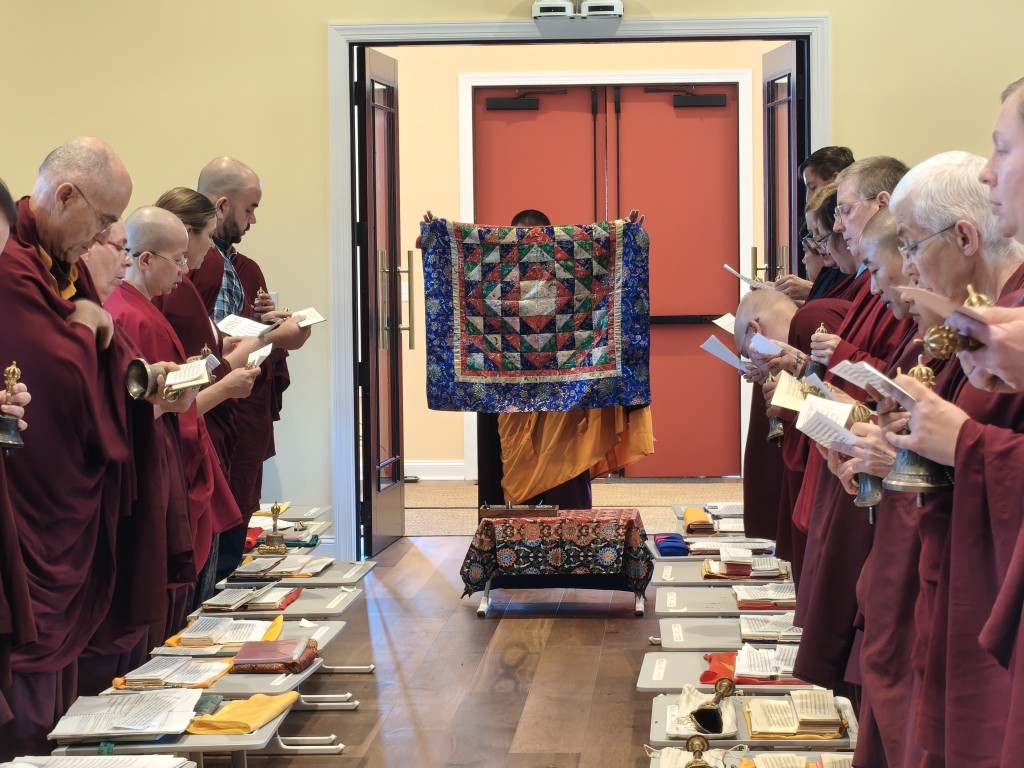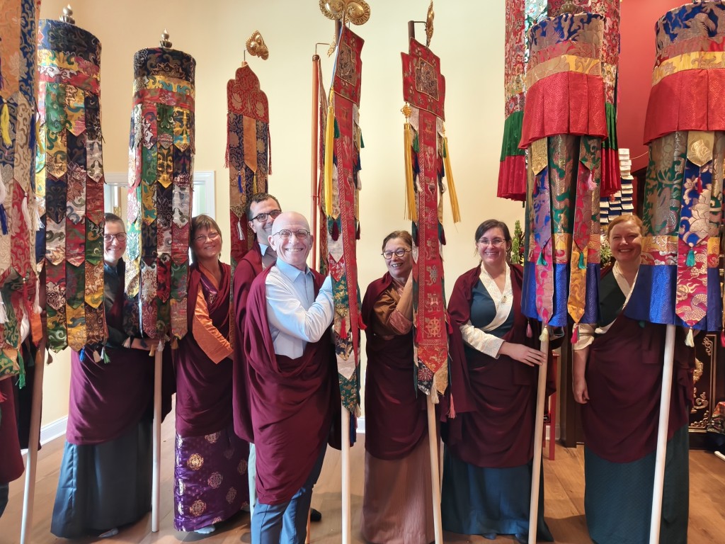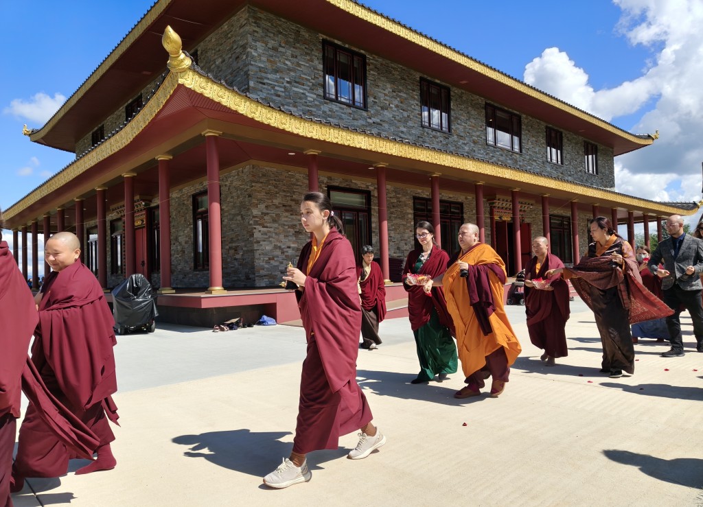 In the summer of 2025 at Mindrolling Lotus Garden, the long-awaited consecration of the newly built temple, Mindrol Gatsal, took place. Mindrolling Lotus Garden sangha members gathered from around the world to take part in this wonderful occasion. The process began with the elaborate po chog, the ritual for transferring the sacred contents, blessings, and siddhis from the old shrine room to the new temple. The po chog was held on the 16th of August, 2025. The ritual centers around the melong, or mirror, that serves as the physical support to gather the jnanasattvas and their blessings that the old shrine room has been imbued with over years of practice, studies, teachings, and transmissions. The melong is then covered in cloth in the colors of the Five Buddha Families and brought in a ceremonial procession from the old temple into the new temple.