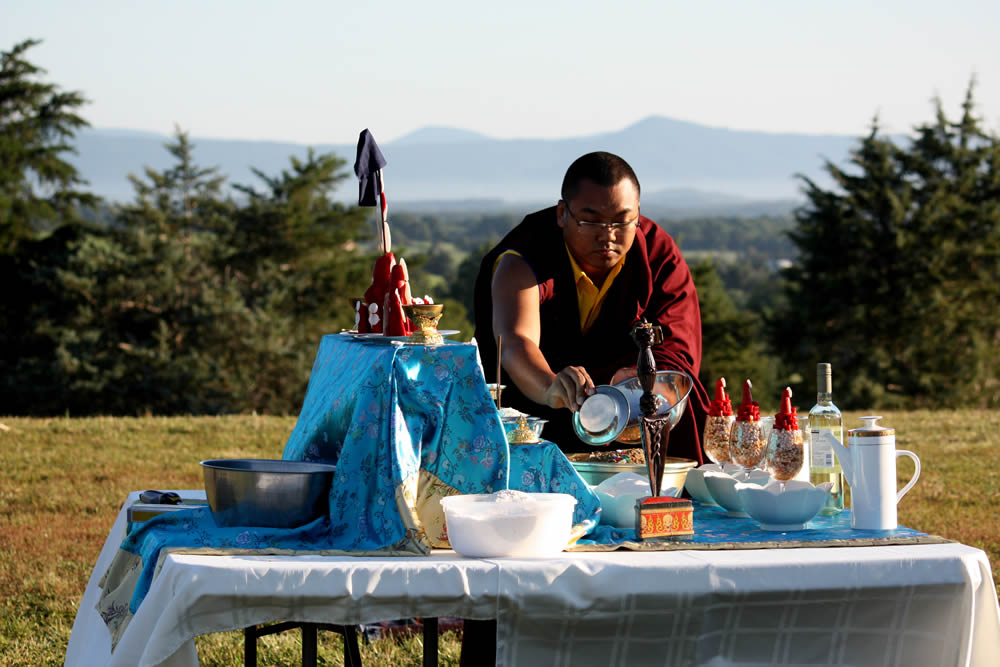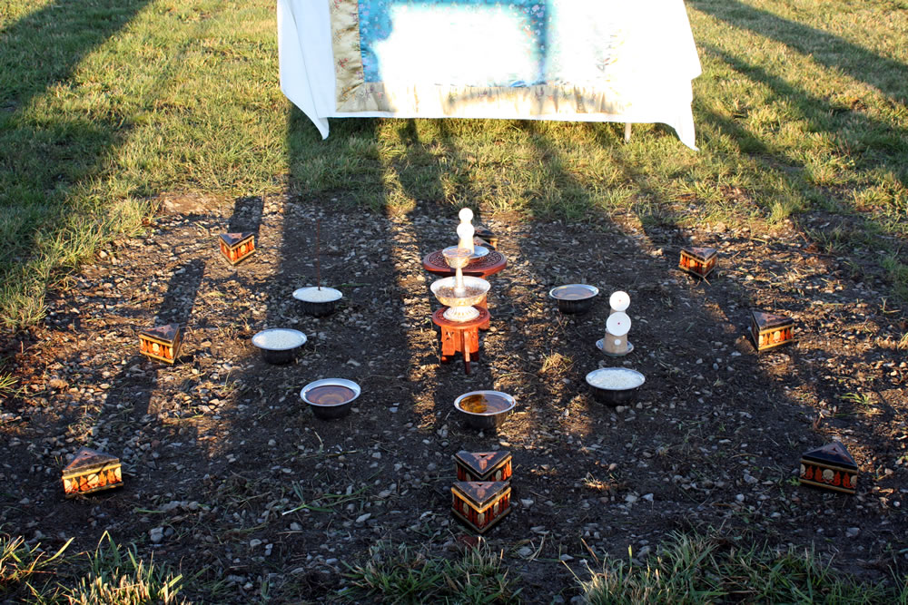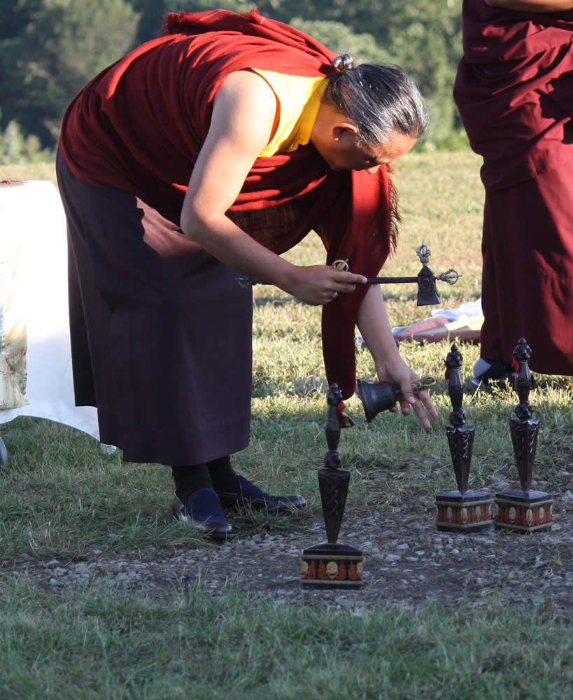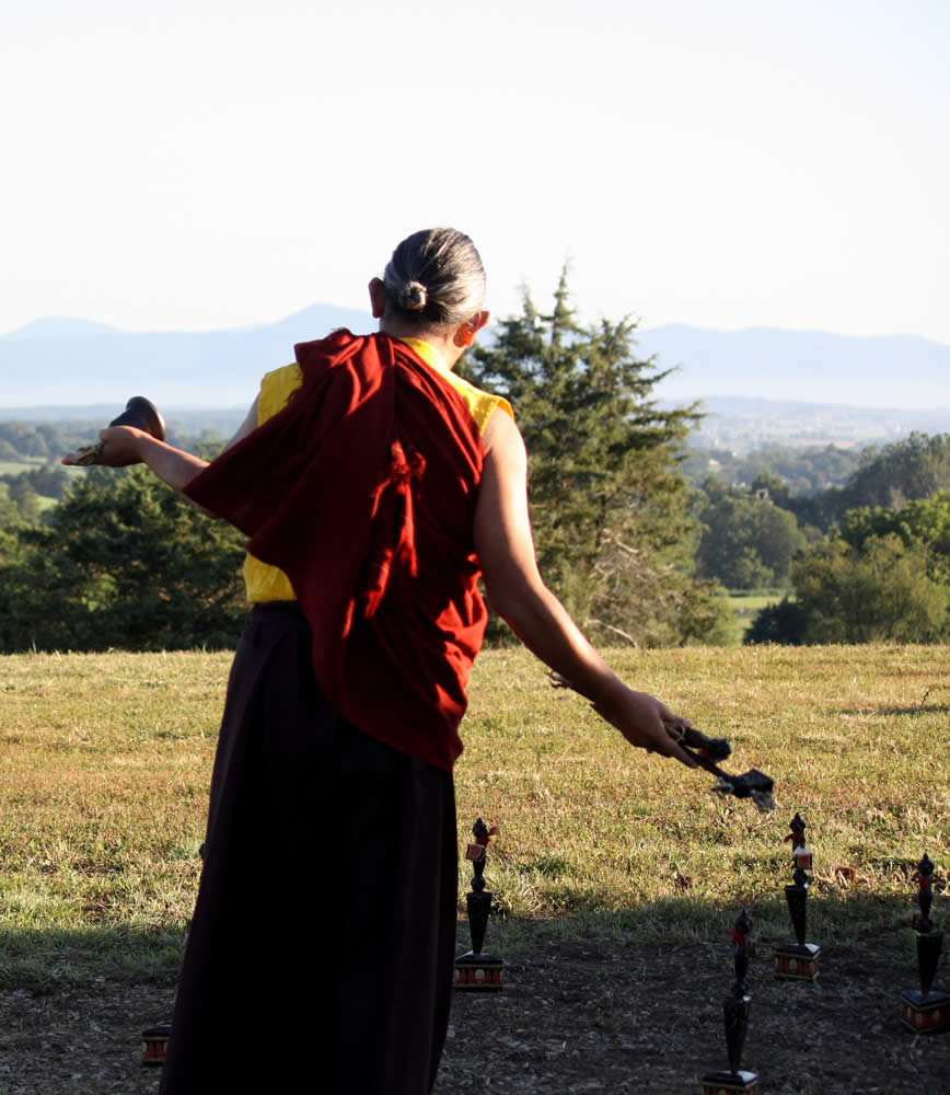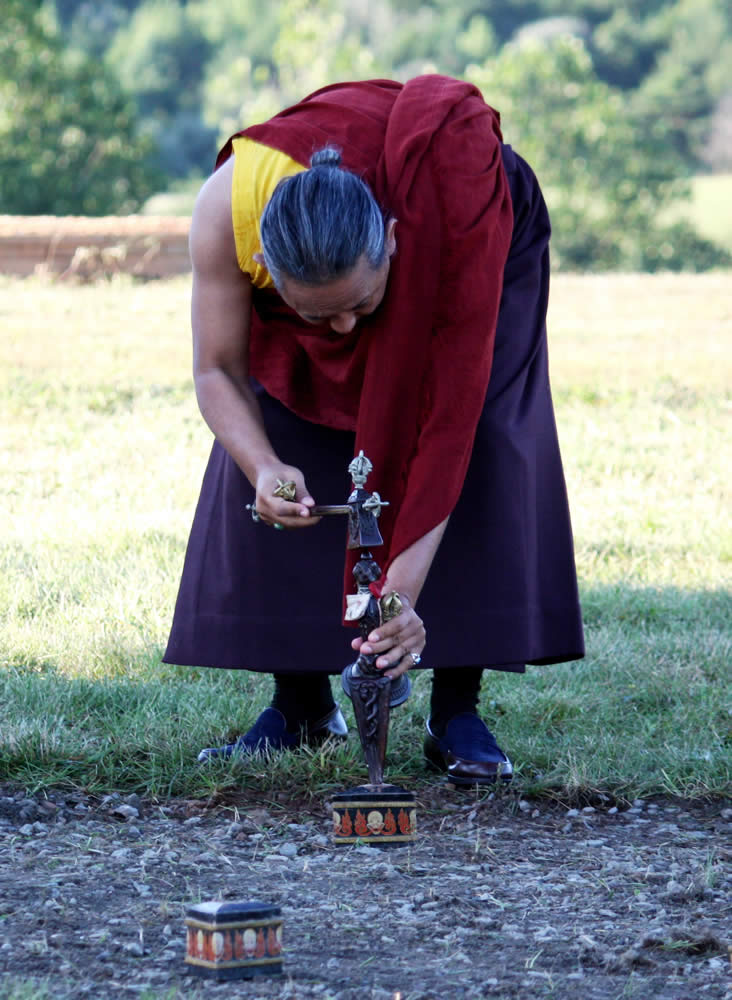 During the Lotus Garden inauguration in 2005 an elevated area encircled by mountains had been chosen as the site for the future temple. HE Khocchen Rinpoche, who was present with a group of Mindrolling monks, performed a fire puja ceremony at the site thus sealing the aspiration to raise a temple at that location. In the years which followed, many teachers have blessed the site and many practices have been performed there, including the annual Minling Dorsem drubchö held to purify and bless the site.